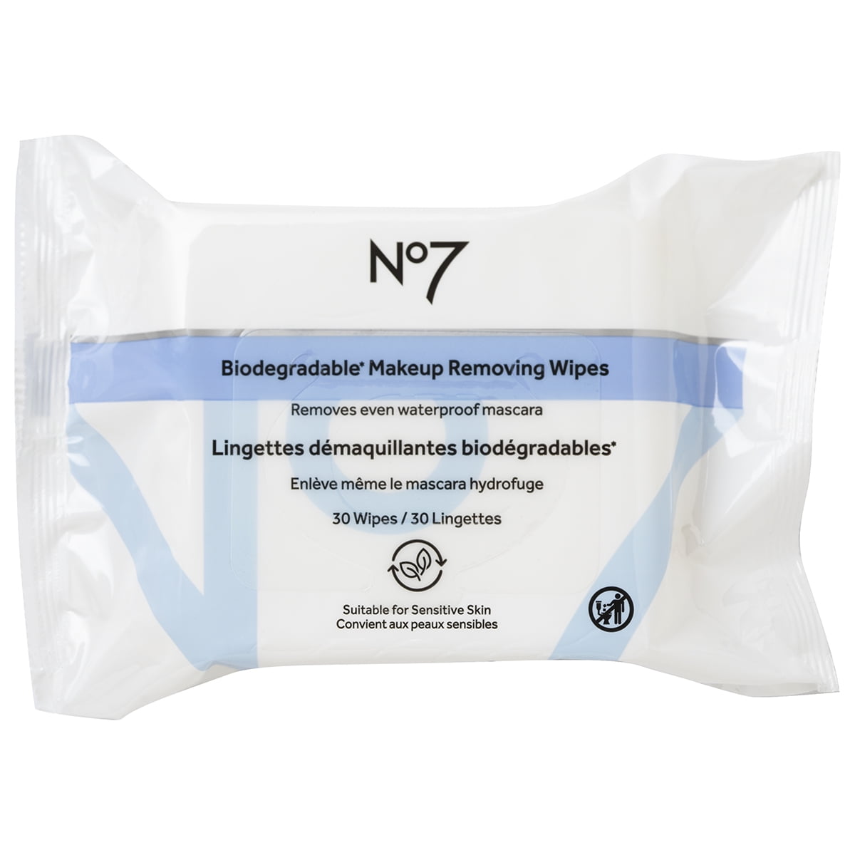 Made from soft, renewable, plant-based fibers, No7 Makeup Removing Wipes are now fully biodegradable* and kinder to the planet than ever before. Perfect for when you are short on time, these cleansing wipes help clear pores and clean skin of impurities and makeup, for skin that feels thoroughly cleansed and revitalized. Formulated to help protect your skin’s natural healthy balance, they’re infused with purified water, Ginseng and Vitamin E for a radiant, healthier-looking complexion.