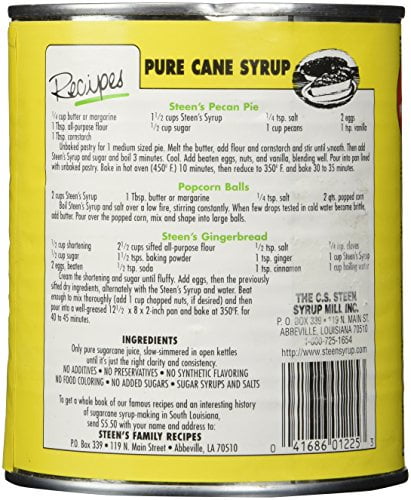 - Pure & natural. No preservatives. Nothing added. Nothing extracted. Open kettle. No additives. No preservatives. No synthetic flavoring. No food coloring. No added sugars. Sugar syrup and salts. To get a whole book of our famous recipes and an interesting history of sugarcane syrup-making in South Louisiana, send $5.50 with your name and address to: Steen’s Family Recipes, PO Box 339, 119 N. Main Street, Abbeville, LA 70510. http://www.steensyrup.com.