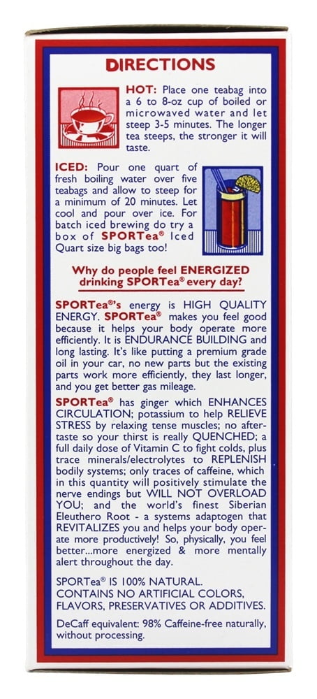 - With green tea, vitamin C, electrolytes & Siberian eleuthero root. Hot Tea: 20 cup size teabags. Everest expeditions official beverage. Energize your day! Mind. Body. Spirit. Peak performance & balance. The ultimate daily beverage! No calories. Decaff. equiv. No sodium. To experience Sportea online, use a QR code reader app on your smartphone and scan! Why Sportea? The Ultimate Daily Beverage! 1. Award Winning: Named Colorado’s Best – a hearty, satisfying taste plus important daily nutrients and health promoting botanicals! Sportea is truly one of a kind! 2. Nutritious: Daily replenishment of vitamin C & electrolytes, plus nourishment from Siberian eleuthero root – a potent superfood used daily by Olympic athletes. 3. Natural Energizer: Invigorating – a boost of energy, but no sugar or caffeine letdown (decaf equivalent – less than 2% caffeine) Fights fatigue, promotes mental alertness, builds stamina, sustaining. 4. Stress Fighter: Replenishes potassium and trace minerals depleted during physical and mental stress. Soothing, circulation enhancing (ginger) and a bodily systems endurance builder (Siberian eleuthero root). 5. Thirst Quencher: Absolutely clean and refreshing, no undesirables – no sugar, no artificial sweeteners, no salt, no calories & no aftertaste! Lite. Delicious. Sustaining! 6. Distinctive Flavor: A premium blend of rare teas, herb and spices like soothing ginger, plus naturally derived citrus flavorings – a bold CitrusSweet taste with a zip! Stimulating! 7. Quality Packaging: A protective outer wrap and super-fresh resealable pouch reflects our commitment to purity and long term potency of this premium tea! Energize your day! Sportea never failed to give me the lift I needed under the harsh conditions we were exposed to on Everest. -Dave Saas, Everest Expedition Leader. Why do people feel energized drinking Sportea every day? Sportea’s energy is high quality energy. Sportea makes you feel good because it helps your body operate more efficiently. It is endurance building and long lasting. It’s like putting a premium grade oil in your car, no new parts but the existing parts work more efficiently, they last longer, and you get better gas mileage. Sportea has ginger which enhances circulation; potassium to help relieve stress by relaxing tense muscles; no aftertaste so your thirst is really quenched; a full daily dose of vitamin C to fight colds, plus trace minerals/electrolytes to replenish bodily systems; only traces of caffeine, which in this quantity will positively stimulate the nerve endings but will not overload you; and the world’s finest Siberian eleuthero root – a systems adaptogen that revitalizes you and helps your body operate more productively! So, physically, you feel better – more energized & more mentally alert throughout the day. Sportea is 100% natural contains no artificial colors, flavors, preservatives or additives. Decaf equivalent: 98% caffeine-free naturally, without processing. All natural, citrussweet, Sportea is packed full of rare teas, herbs, and spices do that in combination, Sportea fights fatigue, boosts energy, and builds stamina! Ultimate Performance Products, Inc has developed a special amber colored, resealable super-fresh bag. It is designed to keep the delicate botanicals and vitamin C stable and fresh as it is light resistant, air resistant, and water resistant. So please so keep the bag closed between uses to keep your tea at peak freshness. www.Sportea.com. Sustainable Forest Initiative. Certified sourcing. www.sfiprogram.org. Paperboard packaging recyclable. Carton made with wind energy. Made in the USA.