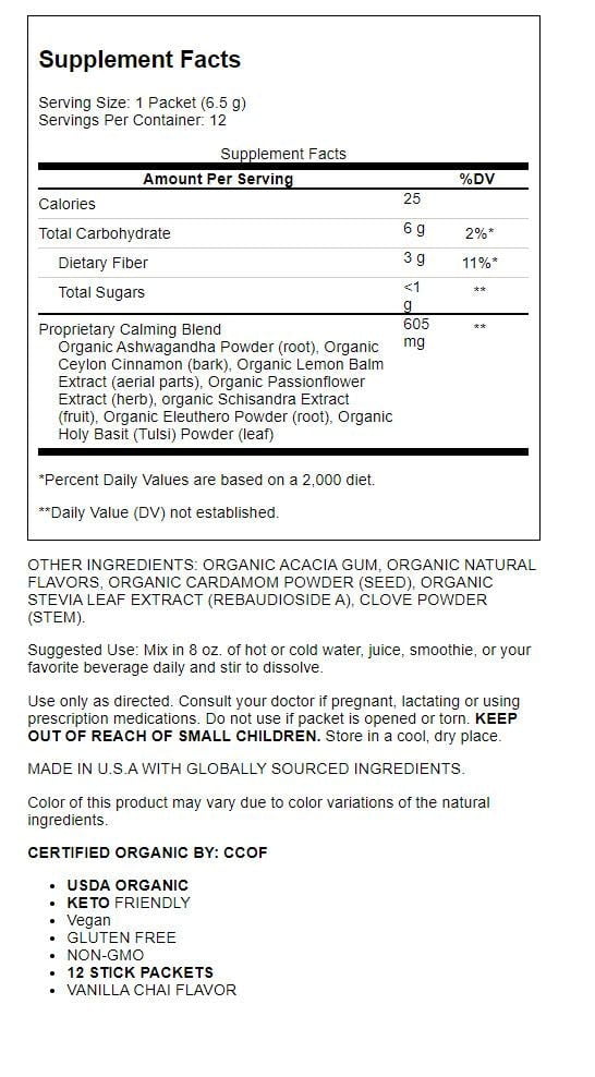 BareOrganics Calm Superfood Water Enhancer – Vanilla Chai 12 Pkts