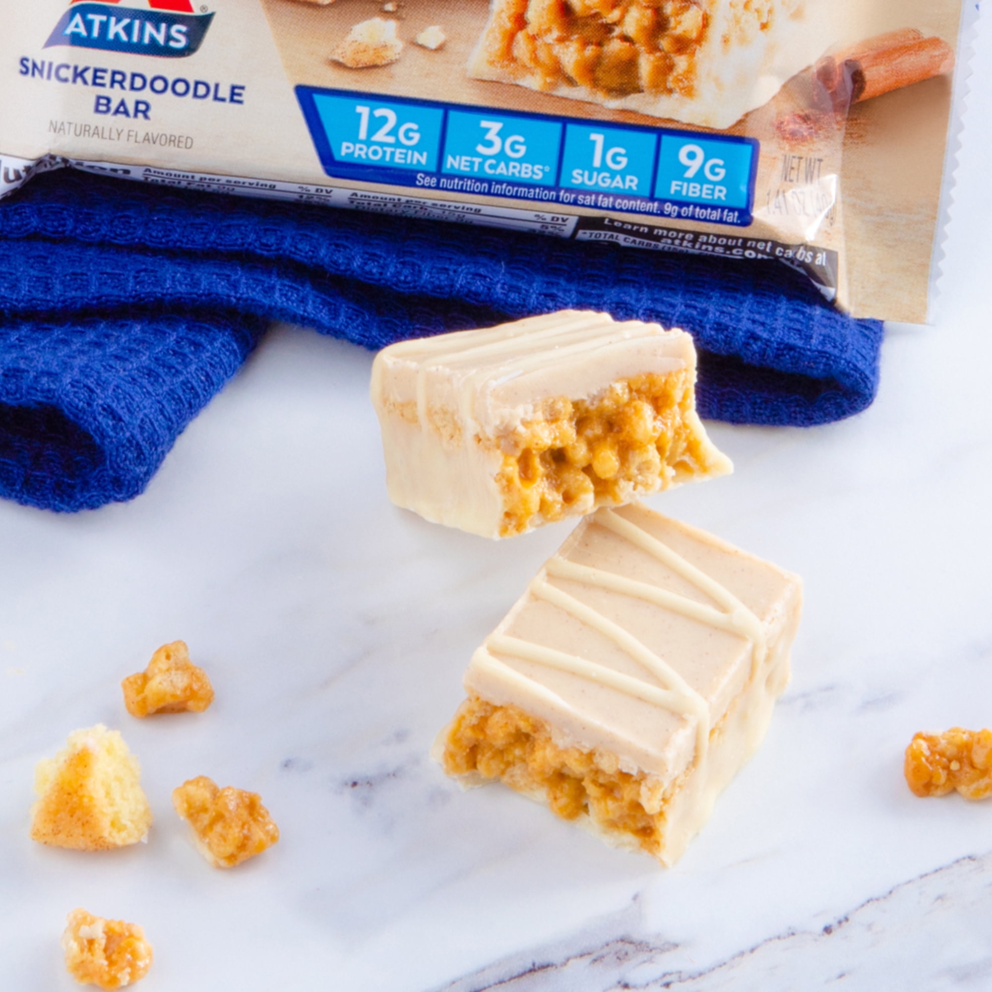- PROTEIN & FIBER TO STAY ON TRACK. Stay true to the Atkins Diet and Lifestyle with our gluten free Snickerdoodle Snack Bar. It provides 12 grams of protein and 9 grams of fiber per serving to help you achieve your daily protein and fiber intake goals.