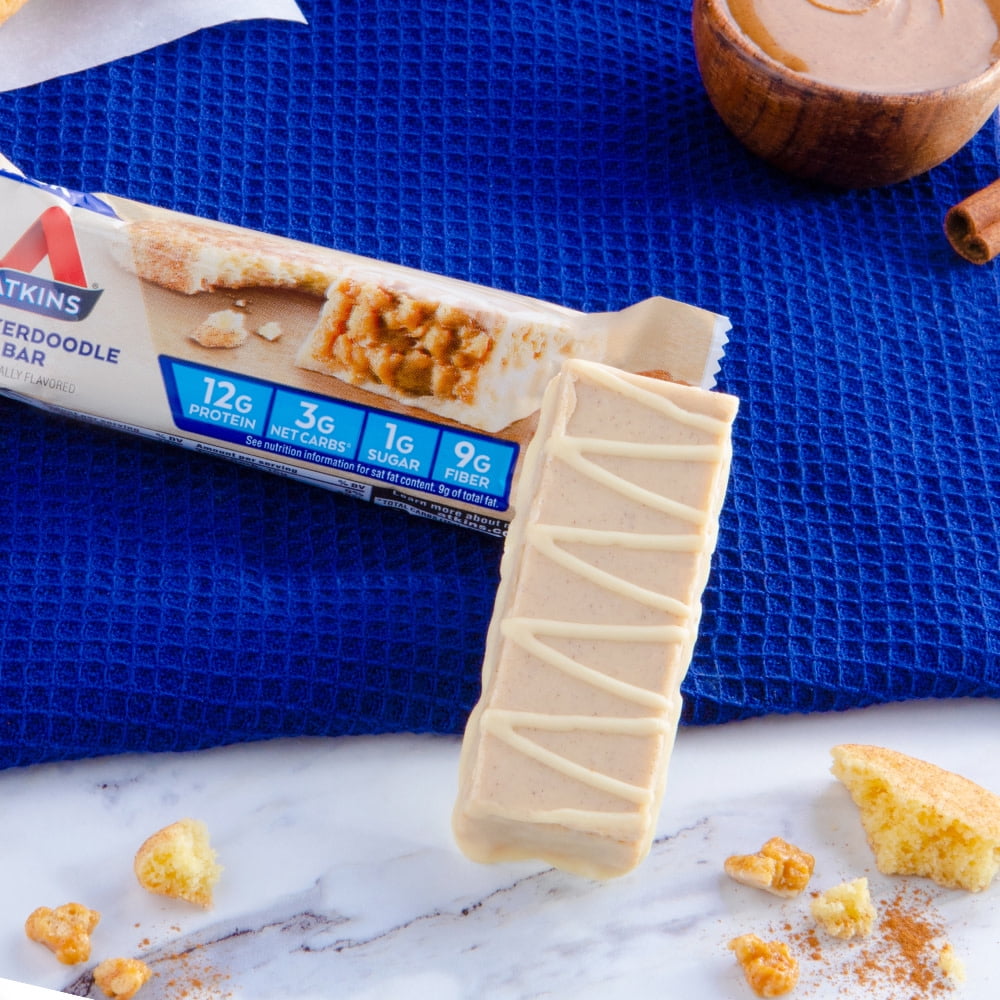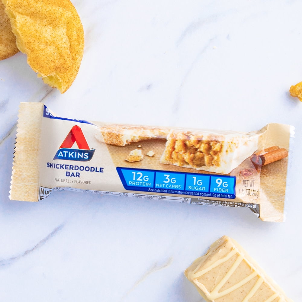 - SNICKERDOODLE SNACK BAR. This is today’s Atkins. Let this Atkins snack bar delight your taste buds while delivering essential vitamins. Each box includes 5 ready-to-eat 1.41 oz bars.