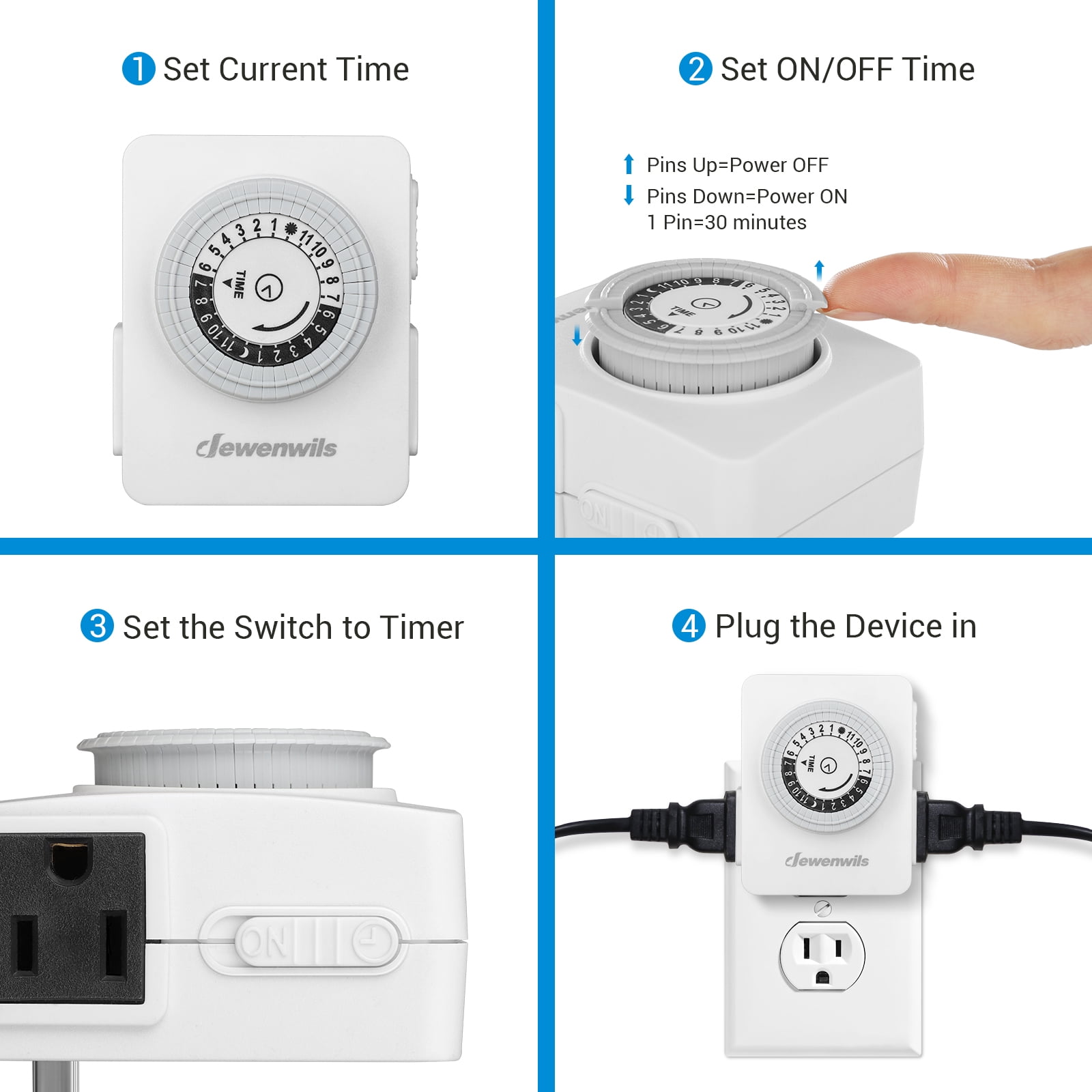 - SCHEDULE YOUR DEVICES EASILY – With the fully programmable timer setting, you can turn on/off your devices at a minimum of 30-minute intervals in a 24-hour cycle, using 48 pushpins to adjust the amount of time the device is on