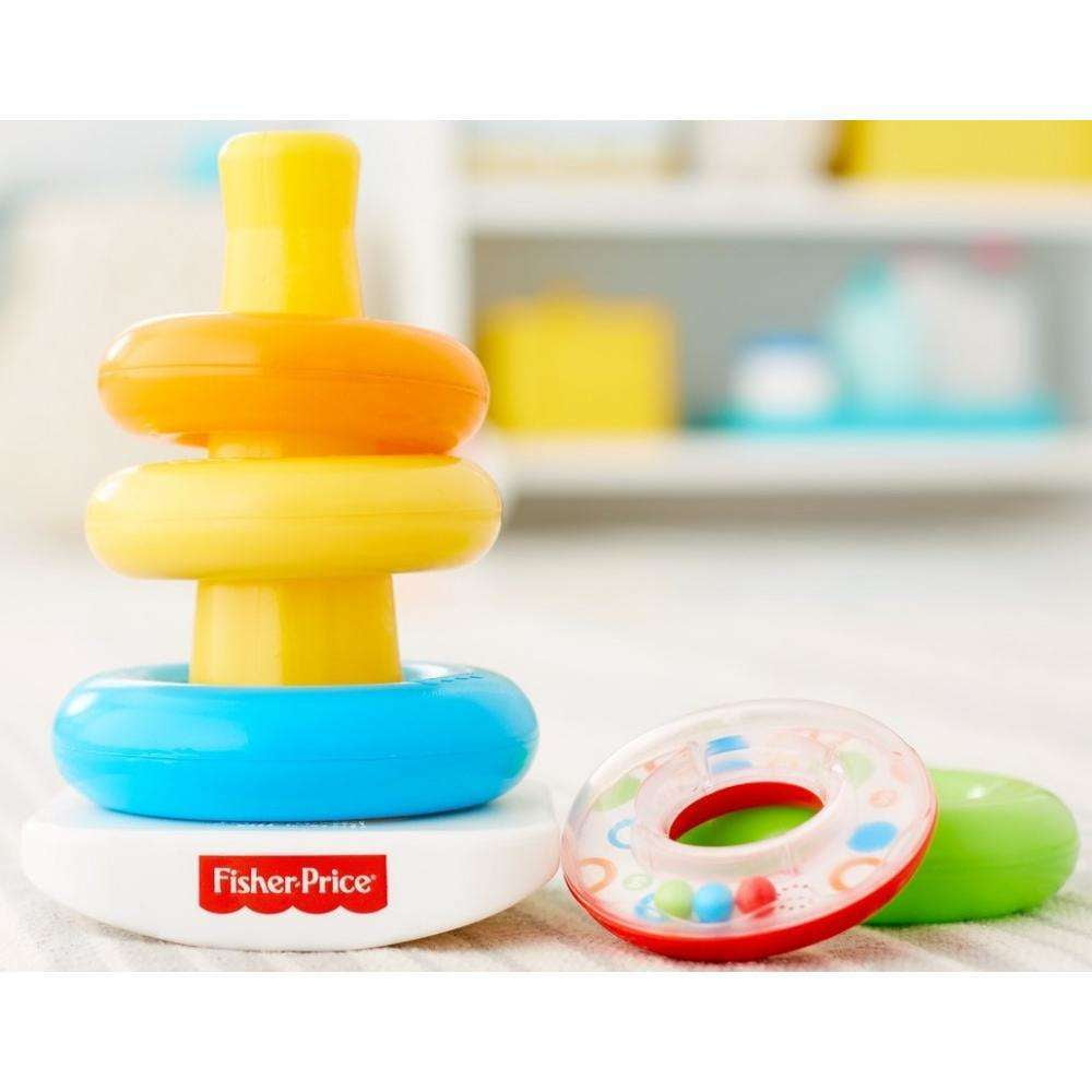 The Fisher-Price Rock-a-Stack toy is classic, colorful fun for your little one! Younger babies will love grasping, holding, shaking and exploring the five colorful rings. the littlest ring has a shiny, reflective surface for baby to discover inside-with colorful, swirling beads that make fun rattle sounds! When they’re ready to sit and stack, babies can place the rings on the post, then bat at the wobbly base to make it rock back and forth. Stacking helps them develop hand-eye coordination and introduces them to the concept of relative size as they learn to sort and stack from biggest to smallest!