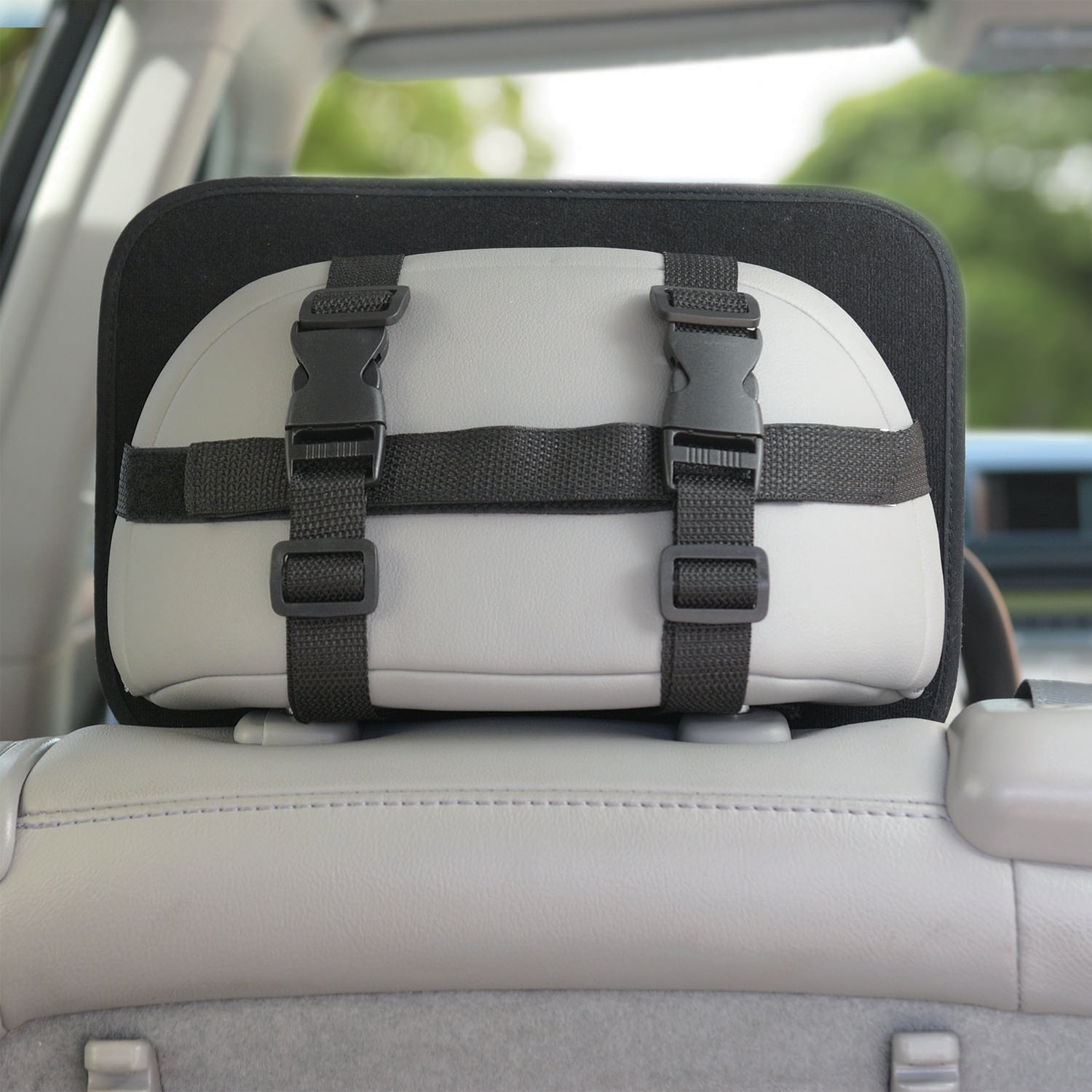 - Large mirror easily attaches to headrest