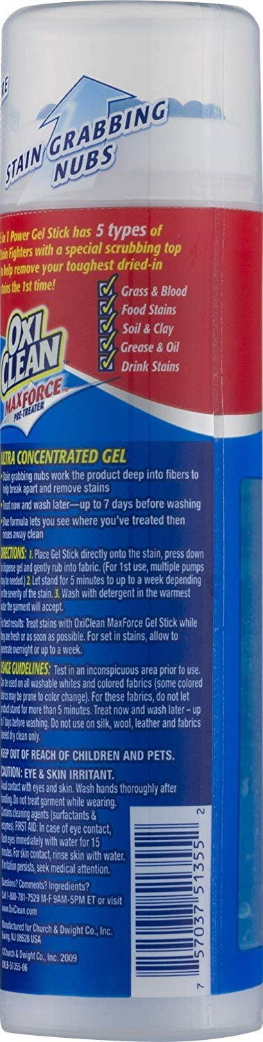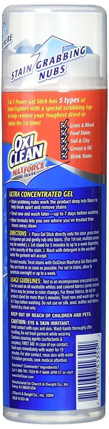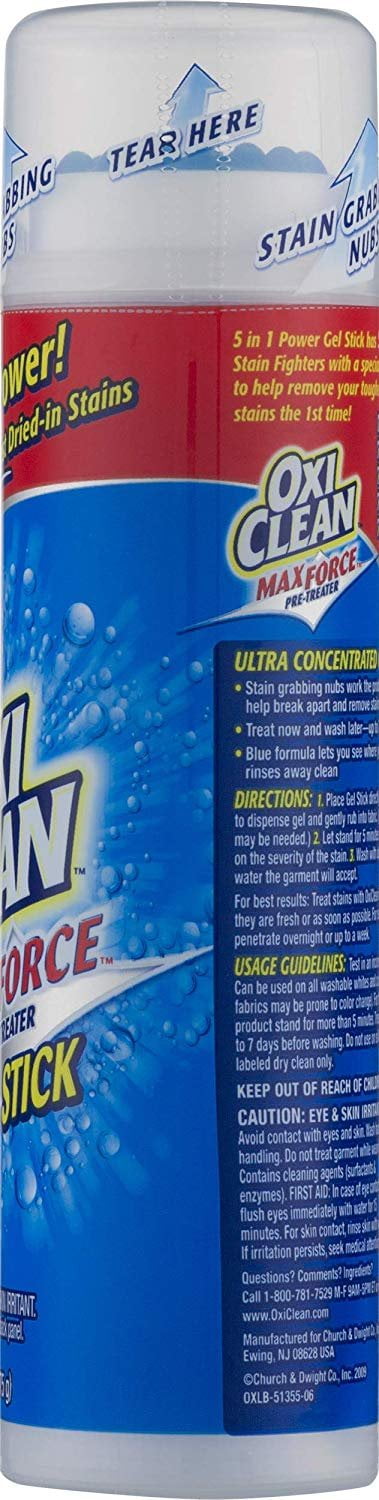 Details OxiClean Max Force Pre-Treater Gel Stick Help get stains out the first time with the new Max Force Gel Stick pretreated. Its special applicator helps get deep into the clothing fibers, where the thick gel formula sticks to stains and breaks them down. The color-safe formula is packed with 4 types of stain fighters, Amylase Enzyme lifts food stains from fabric Solvents/Surfactants dissolves and traps grease and biopolymers bind to dirt and soils to suspend and rinse them away Protease Enzyme targets protein stains like grass and blood Ultra Concentrated gel formula has more power in every drop Smooth top scrubber removes stains without damaging the fabric. Directions For laundry use only allow following manufacturer guidelines for the item being cleaned. Place gel Stick directly onto the stain, press down to dispense gel, and rub into fabric. For 1st use, multiple pumps may be needed. Allow fabric to stand 5-10 minutes, depending on the severity of the stain. Wash in the warmest water the garment will accept. Warnings, Eye irritants Avoid eye contact Harmful if swallowed Keep out of reach of children and pets If contact occurs, flush immediately with water for 10-15 minutes If swallowed, rinse mouth and drink a glass of water In either case, call a physician If on the skin, rinse thoroughly with water.