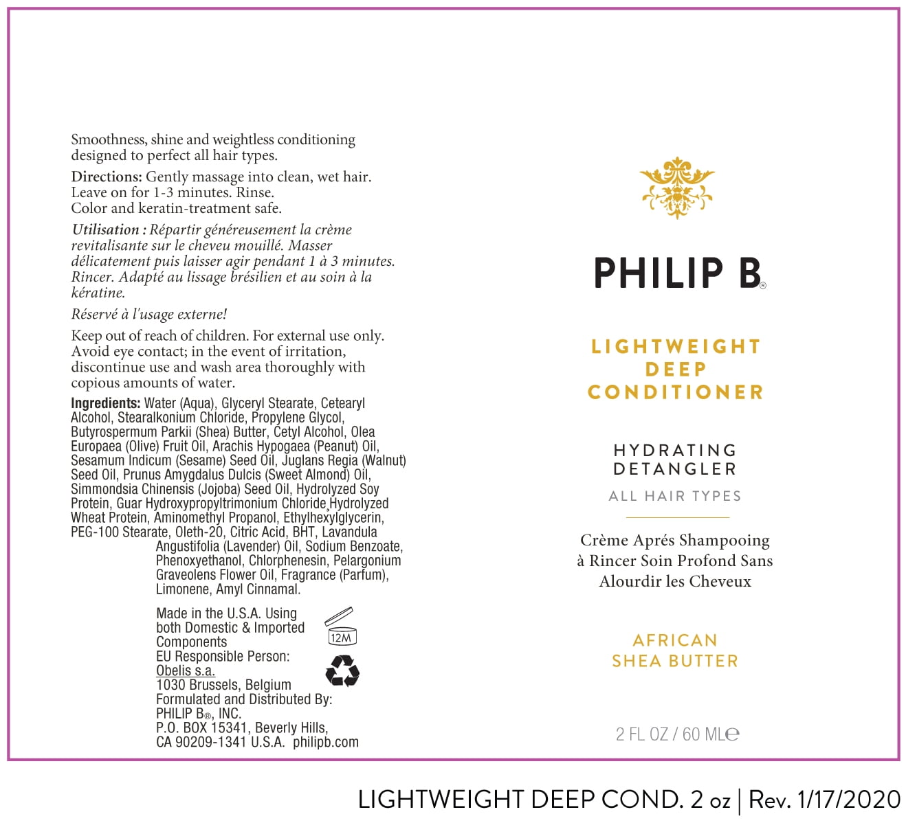 Philip B Lightweight Deep Conditioner. An award-winning hydrating and detangling blend of plant and flower extracts that smoothes and eliminates frizz while imparting strength. Lightweight Deep Conditioner adds gorgeous shine to hair without dragging it down. Tames frizz, seals split ends and leaves hair silky and tangle-free. A rich, fortifying blend of African Shea Butter, Wheat Germ and Soy Proteins locks in moisture. Vitamin-rich essential oils including California Lemon, Orange, Lavender and Gardenia lend softness, shine and a sumptuous scent.
