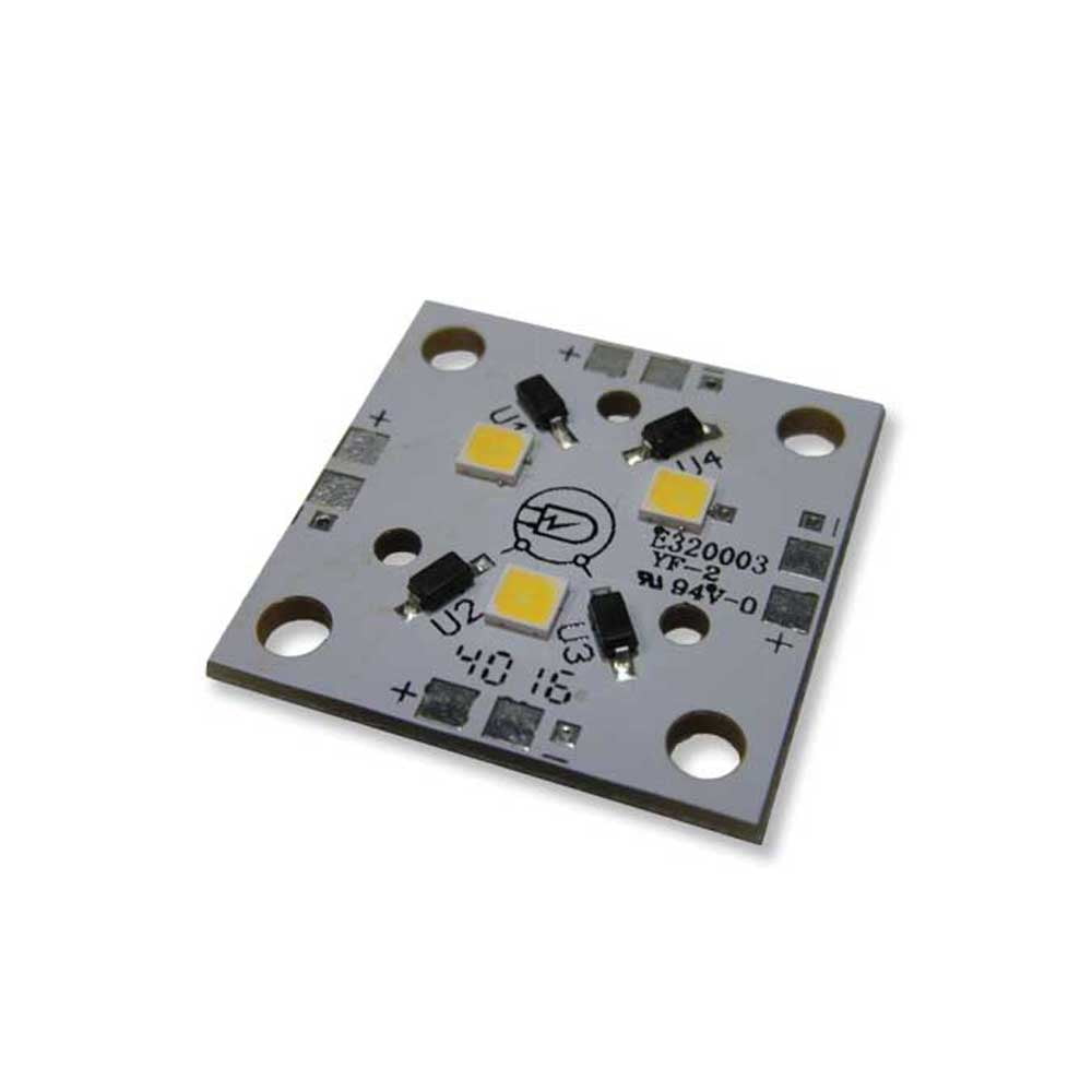 The LUXdrive DynaSquare is a discrete, constant voltage 12V LED light engine (No CC Driver Required!). The 1” square PCB houses 3 Nichia 757 high performance, mid-power LEDs along with on-board drivers. The on-board driver circuitry makes it possible for the DynaSquare to accept constant voltage DC input from 11-15VDC. The DynaSquare is PWM dimmable, adding to the flexibility of the unit. The board and 757 LEDs can be used with Carclo 3-up Optics. The DynaSquare runs at about 1.5 Watts and outputs up to 150 Lumens! It’s perfect for lamp and luminaire applications and can also be extremely useful in panel and display lighting. The DynaSquare PCB board has convenient .125" diameter mounting holes, that are .125" from each corner. We recommend 4-40 machine mounting screws and the washers should not exceed .25" in diameter. The board design makes it possible to connect multiple boards together (as shown below). The solder connections on each of the four sides make for plenty of different wiring setups. Please contact us at LEDSupply before connecting more than 20 DynaSquares together at one time. The LEDs can also be wired in parallel off of the same power supply. Just make sure your power supply has sufficient wattage (1.5 Watts for every DynaSquare).