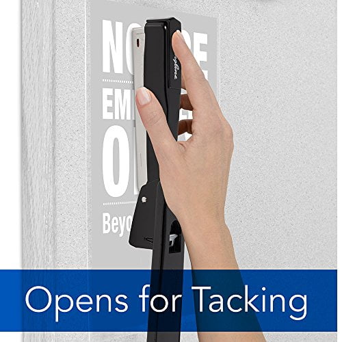 Stapler offers ergonomic stand-up design that takes up less desk space than conventional desktop staplers. Rotating anvil allows stapling and pinning. Design also features comfort hand grips and all-metal working parts. Stapler fastens up to 20 sheets of 20 lb. paper using standard staples. Staple capacity is 210 staples.