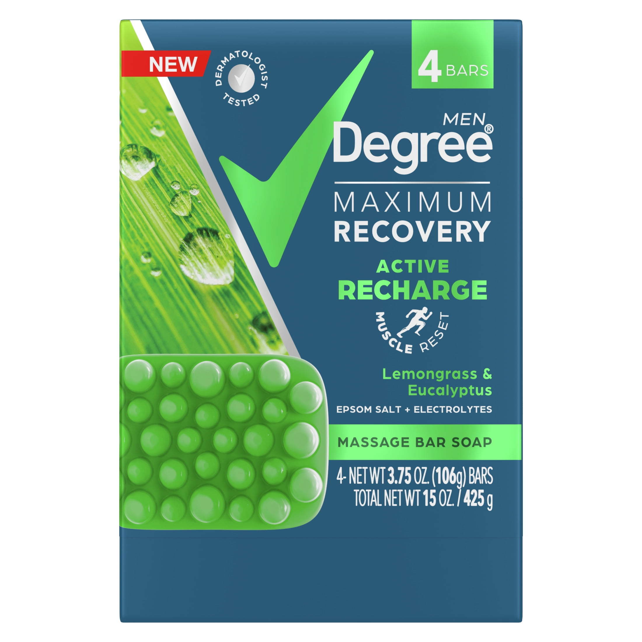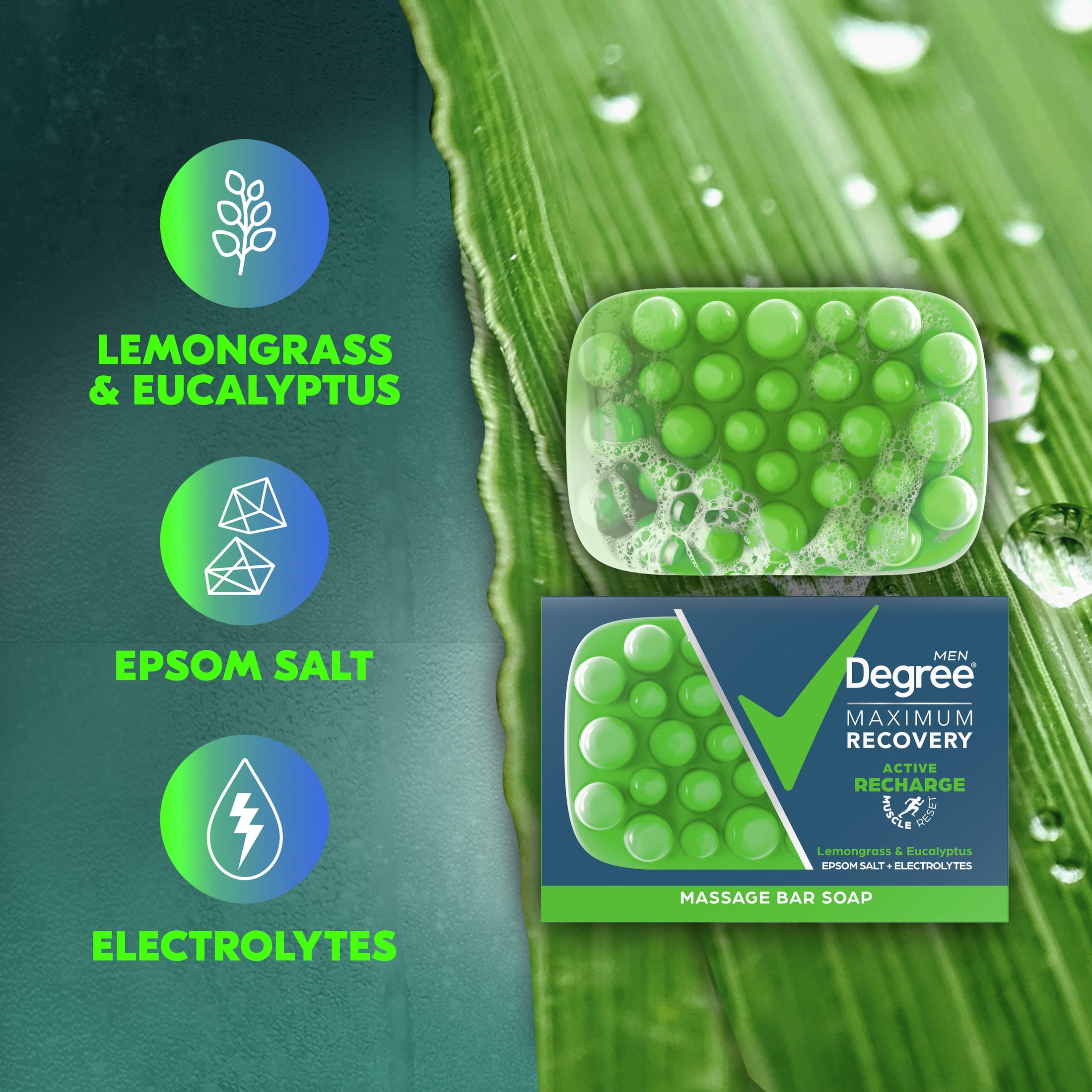 - Degree Maximum Recovery Lemongrass & Eucalyptus Massage Bar Soap is specially designed with massaging nubs to relieve tension while deeply cleansing and refreshing your skin.