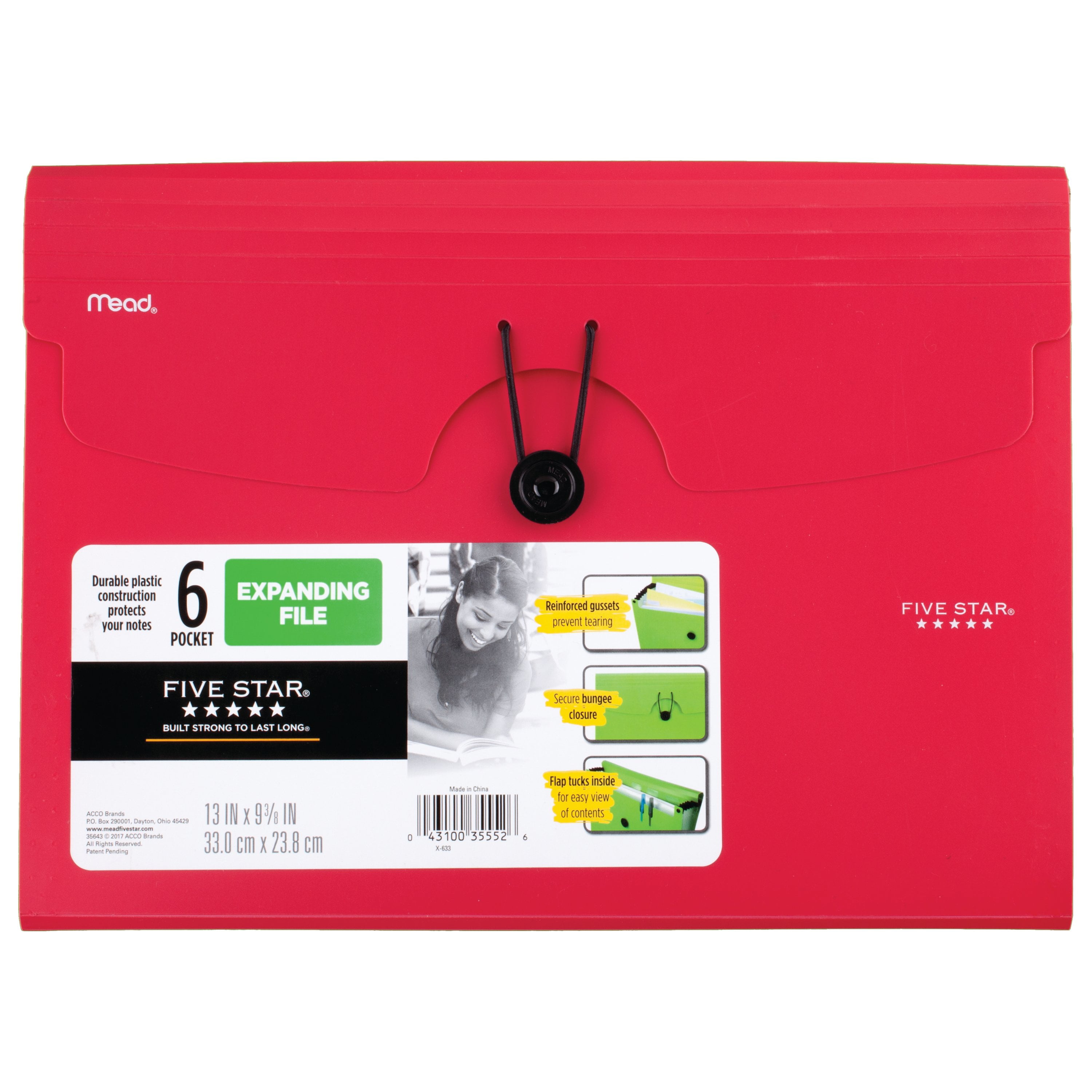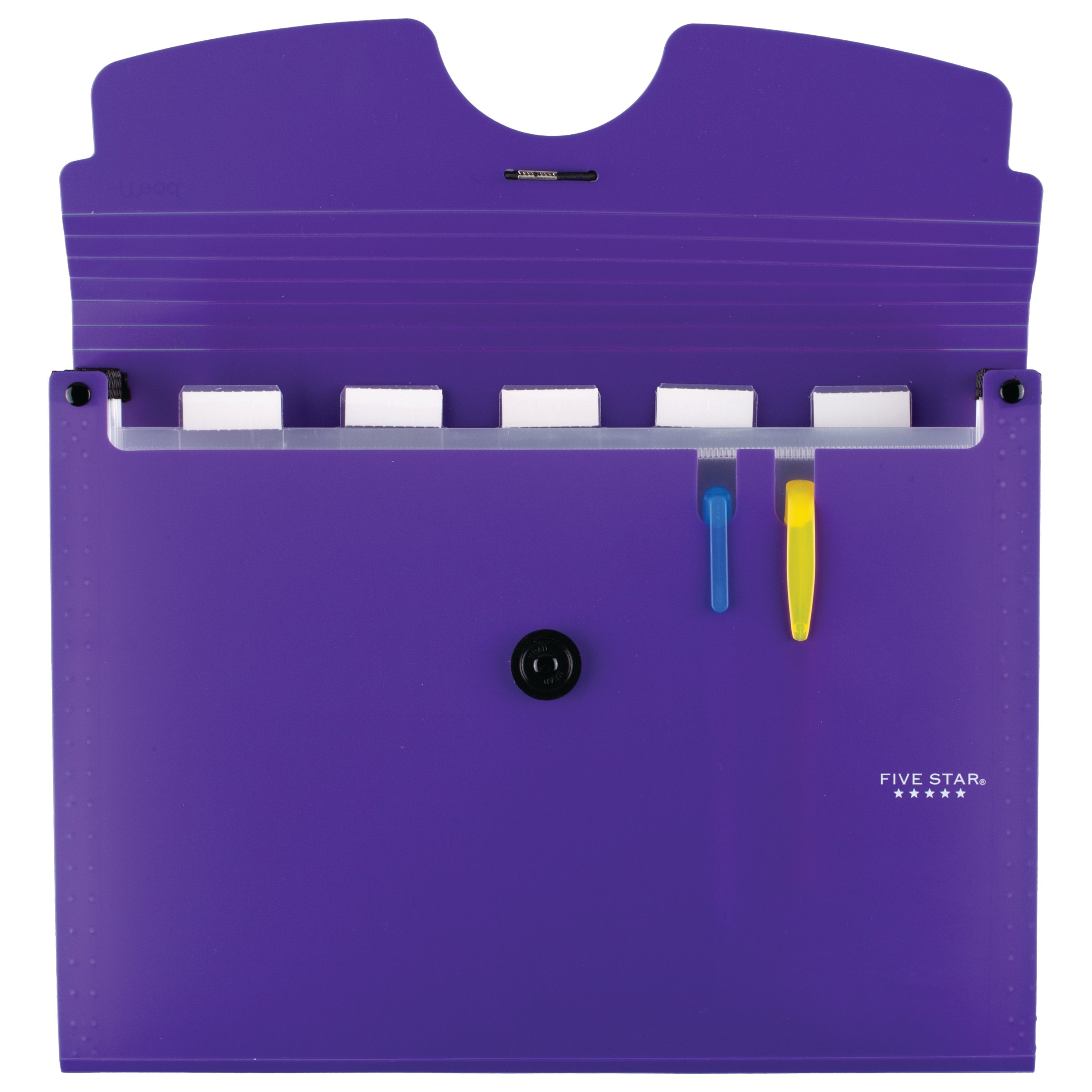 Stay organized throughout the school year with this Five Star 6 Pocket Expanding File. It is ideal for keeping notes, papers and other documents in one place. The vertical construction offers easy access when stored in your backpack, laptop bag or locker. It has reinforced gussets to prevent the edges from tearing so it safely holds files. The divided sections allow you to quickly identify what goes where. Each pocket of the file can be labeled easily so you can keep class papers neatly organized by subjects. This 6-pocket expanding file also features a flap and bungee closure that prevents the contents from falling out while you are on the go and protects papers against the elements.