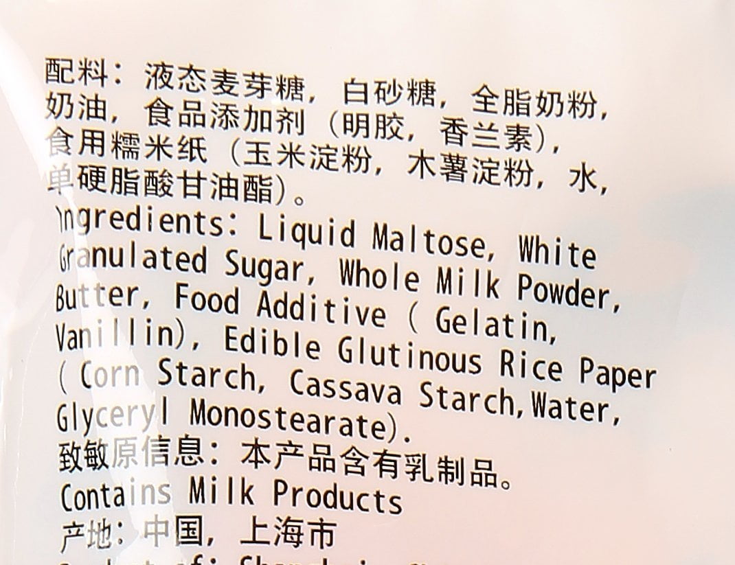 White Rabbit Creamy Candy is white, with a soft, chewy texture, and is formed into cylinders It’s developed in Shanghai since 1942. Each candy is wrapped in a printed waxed paper wrapper, but within this, the sticky candies are again wrapped in a thin edible paper-like wrapping made from sticky rice. The rice wrapping layer is meant to be eaten along with the rest of the candy Allergen Information: Contains Milk