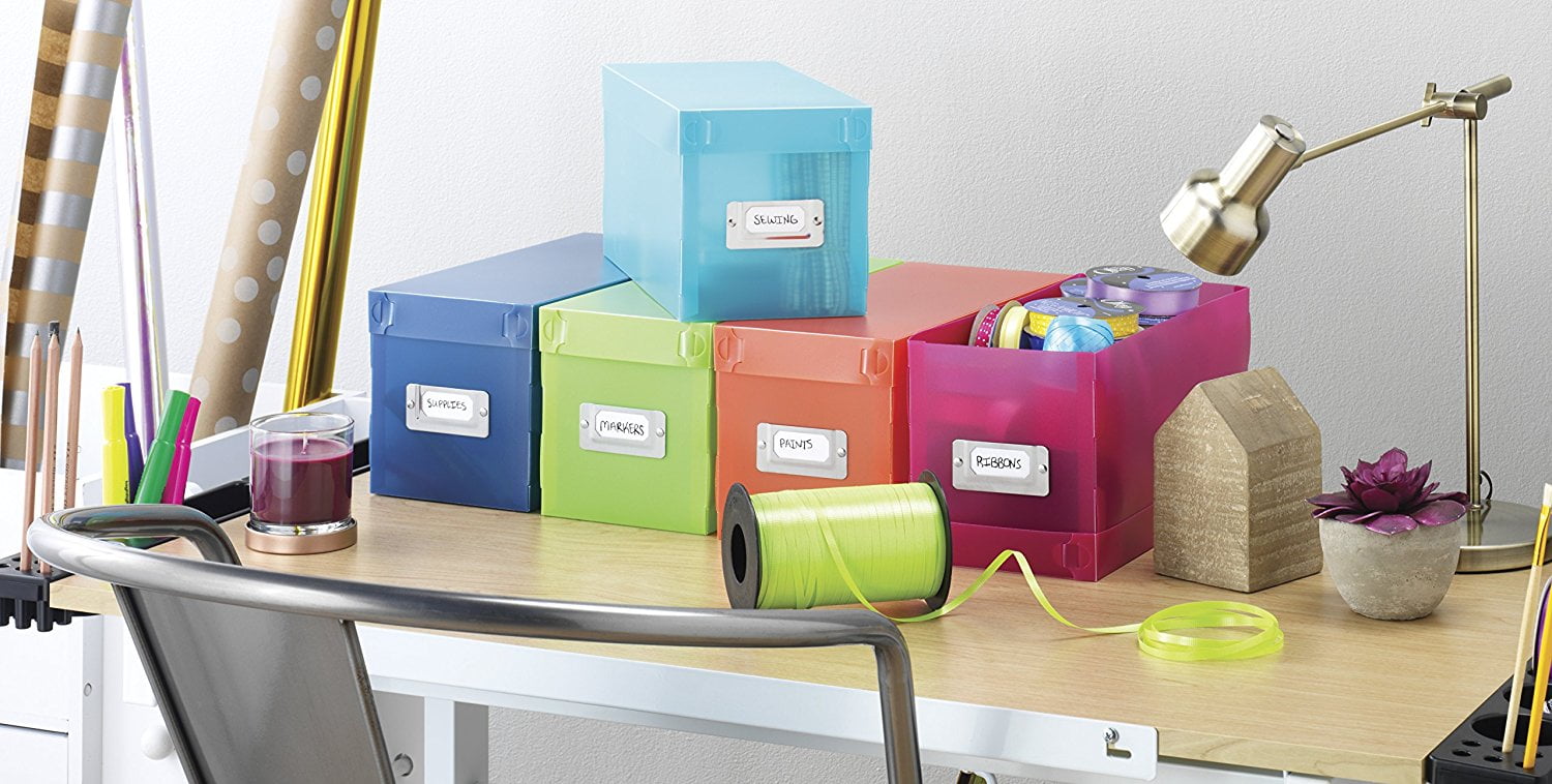 Organize many items by using the Whitmor 5 Piece Plastic Storage Boxes. They can be used to help you save space and keep track of your belongings. These plastic boxes are made of durable material. They are easy to assemble and come in bright fun colors. There is a convenient stainless metal ID plate on the front for easy labeling of the contents of each organizer. The pull out tab makes it easy to access the boxes wherever you decide to keep them stored. They are a must-have for someone who wants to get rid of clutter. The boxes are ideal for your kid’s room, too. You can keep their toys and games off of the floor and stored away.