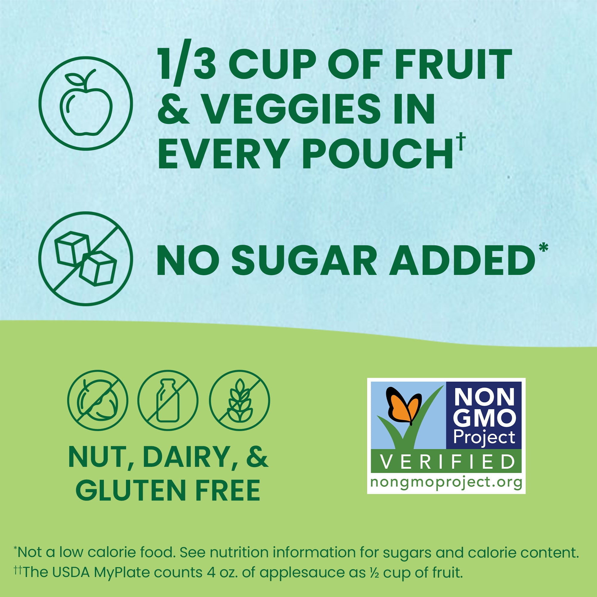 - Unsweetened fruit and veggie pouches made from 100% real fruit, kosher certified, non-GMO, gluten free, nut free, dairy free, no added colors, flavors, or high fructose corn syrup
