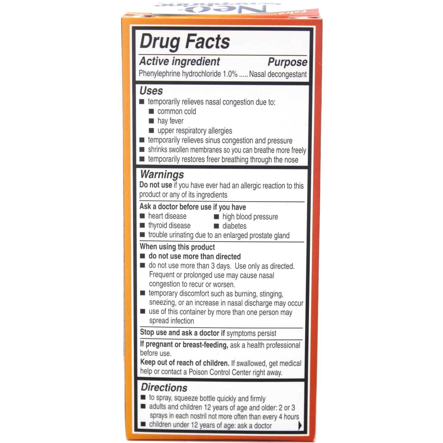 Neo-Synephrine offers extra strength relief from nasal congestion to common cold, hay fever or other upper respiratory allergies without causing drowsiness. Neo-Synephrine contains the maximum dose of decongestant to immediately open your nose and sinuses when you need it most, and temporarily restores freer breathing through the nose – non-drowsy, powerful relief you can use every four hours. Neo-Synephrine offers a pharmacist recommended line of decongestant nasal sprays. Each product has been specifically designed to effectively help you breathe freely when it counts most.