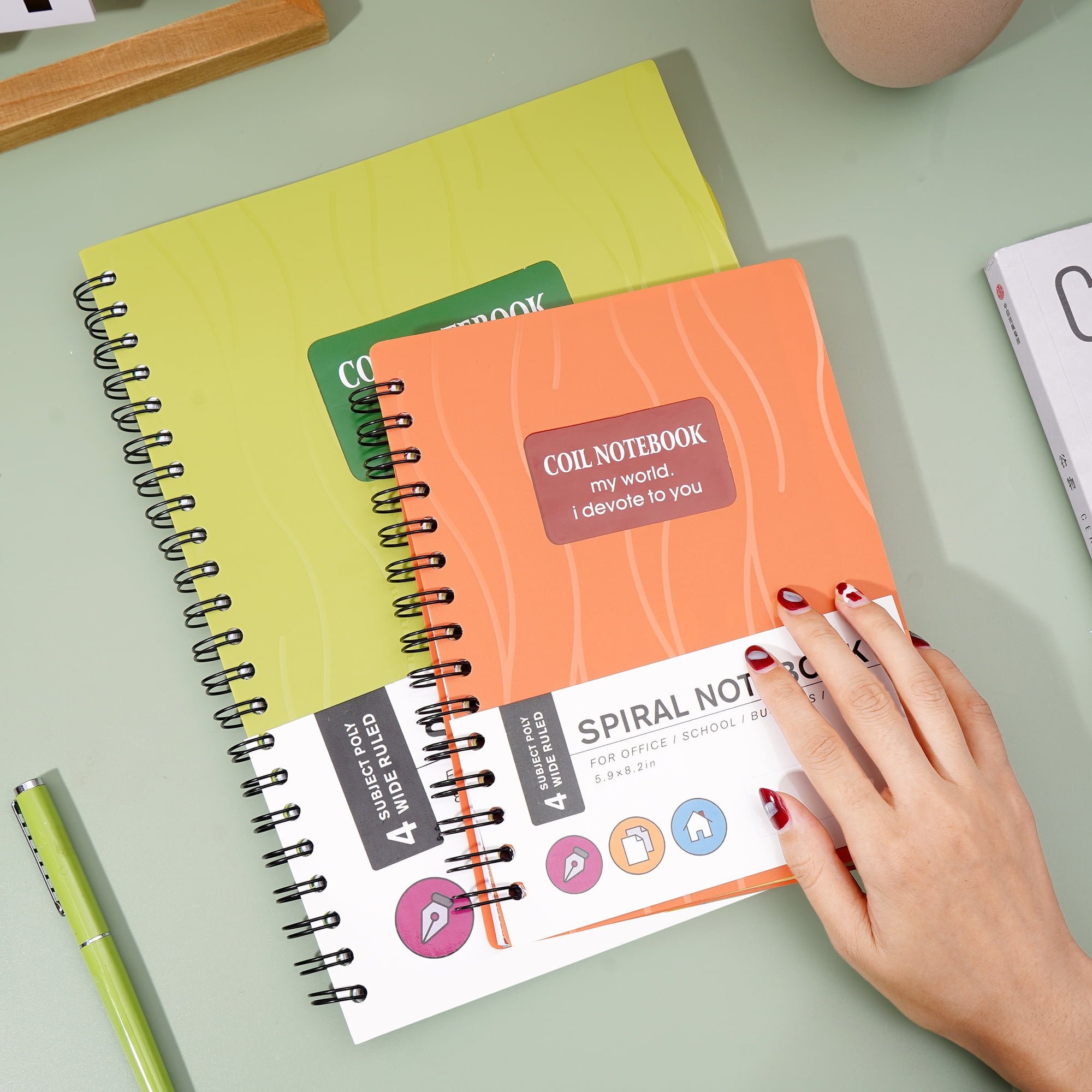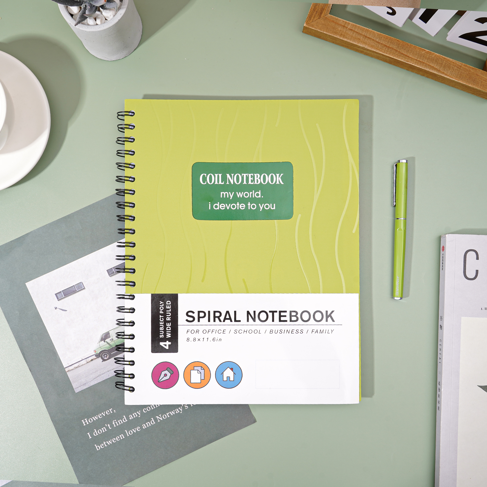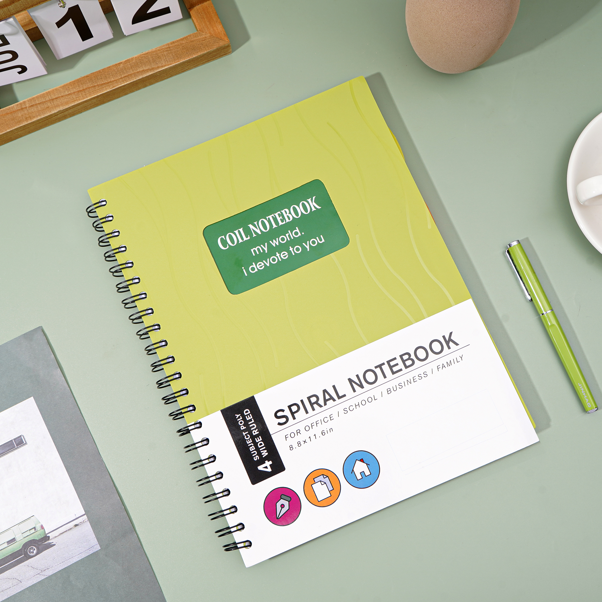 ☺5 SUBJECT NOTEBOOK: Paper size is 8.2” x 11”. Cover size is 8.8" x 11.6". Strong Twin-Wire BindingStrong double binding, so that the paper directly close together. 180° flat design for easy writing. 4 color segmentation to quickly reach specific parts. ☺THICK PP COVER:The cover of the 5 subject notebook is different from the paper materials of other spiral bound journal on the market. We use high-quality plastic materials, waterproof and durable, which can protect the inner pages to the greatest extent. ☺TWO SIZE: This 5 subject coil book is available in A4 and A5 sizes. A5 is portable, suitable for students and family daily records. The large a4 size can enough to organize your school assignments, your office worksheets, and business notes etc. ☺PREMIUM PAPER:Our subject notebook uses 120 sheets environmentally friendly acid-free paper, with soft colors and not glaring, No ghosting, suitable for different pens to write on. ☺GURANTEE:100% after-sale guarantee. If there are any problems with the purchase, please feel free to contact us, we will help to fix the problem.5 Subject Spiral Notebook with Dividers Wide Ruled 8.5"x 11" Hardcover Spiral Notebooks for Work Notebook with Tabs A4 Lined Notebook for College Students Writing Journal School Office Supplies, Green