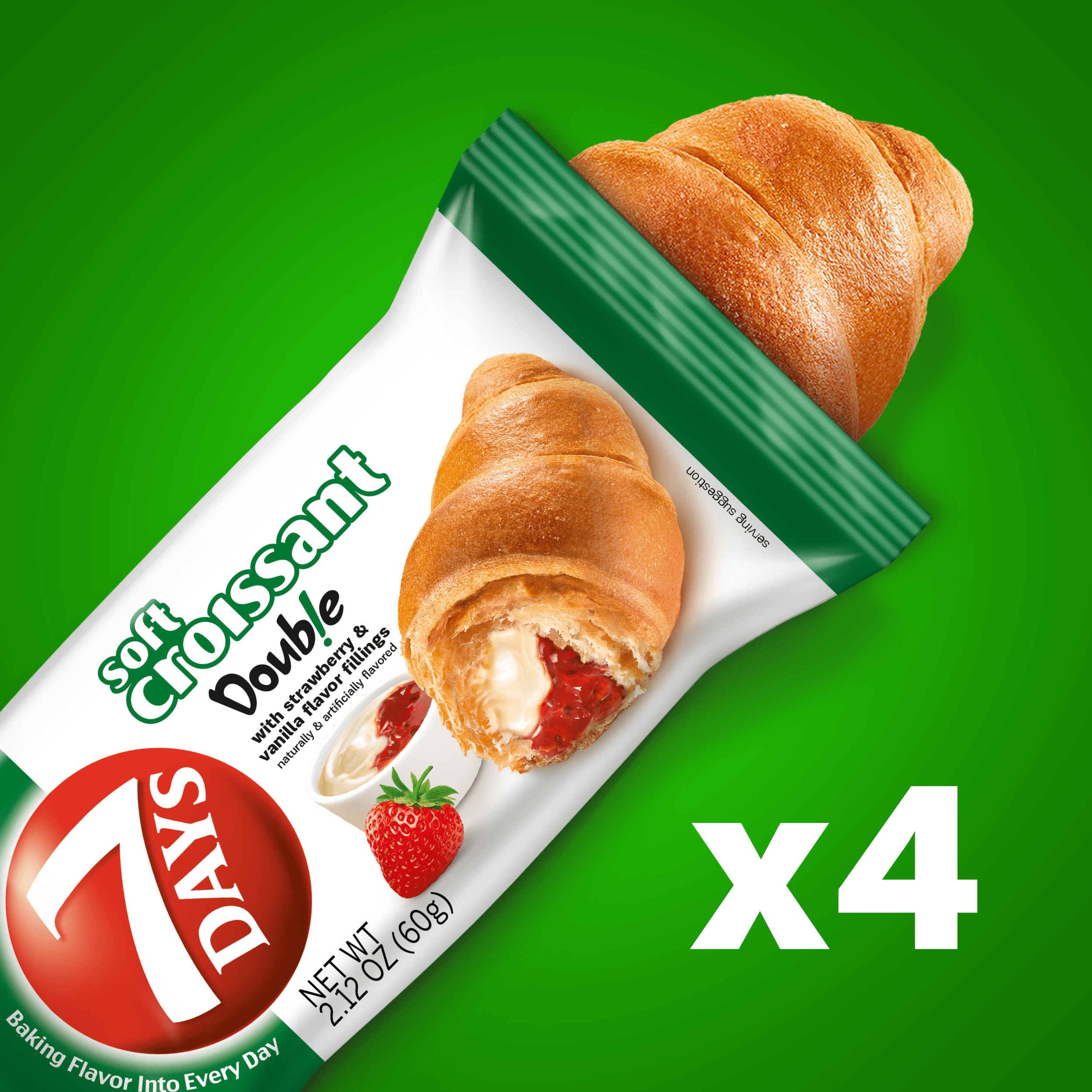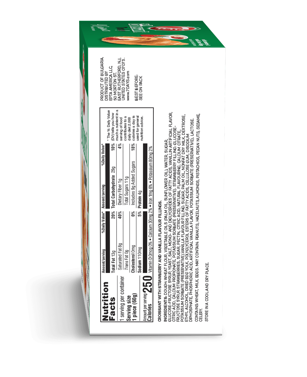 7Days Strawberry & Vanilla Soft Croissants combine soft, flaky layered croissant dough with delicious strawberry & vanilla filling. Sweet but not too sweet, 7Days Strawberry & Vanilla Croissants satisfy hunger in the most delicious way. Each croissant comes individually wrapped and ready to eat – enjoy them at home or on-the-go. Perfect for on the go breakfast pastry or to pack for a school snack! Optional: remove croissant from package and heat in the microwave for 15 seconds. 4 Croissants come in every box.