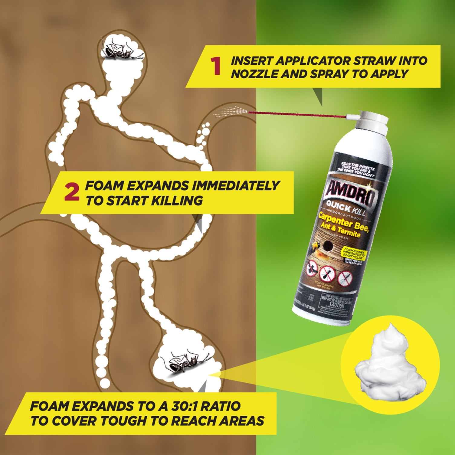 It’s not always easy to identify the culprit of wood damage, but Quick Kill Carpenter Bee, Ant & Termite Killer Foam takes care of carpenter bees, carpenter ants, termites and other listed wood-damaging insects. The non-staining formula in Amdro Quick Kill Carpenter Bee, Ant & Termite Killer Foam works fast to kill destructive insects now and prevents new infestations. Amdro Quick Kill Carpenter Bee, Ant & Termite Killer Foam kills a wide range of listed wood-infesting pests. Amdro Quick Kill Carpenter Bee, Ant & Termite Killer Foam expands and eventually dissipates to kill listed insects where they live. This product includes a straw for targeted application, which makes it great for hard to reach areas and leaves no messy residue. Amdro Quick Kill Carpenter Bee, Ant & Termite Killer Foam kills the insects you see and the ones you don’t. Amdro Quick Kill Carpenter Bee, Ant & Termite Killer Foam expands to a 30:1 ratio to cover those tough to reach areas.