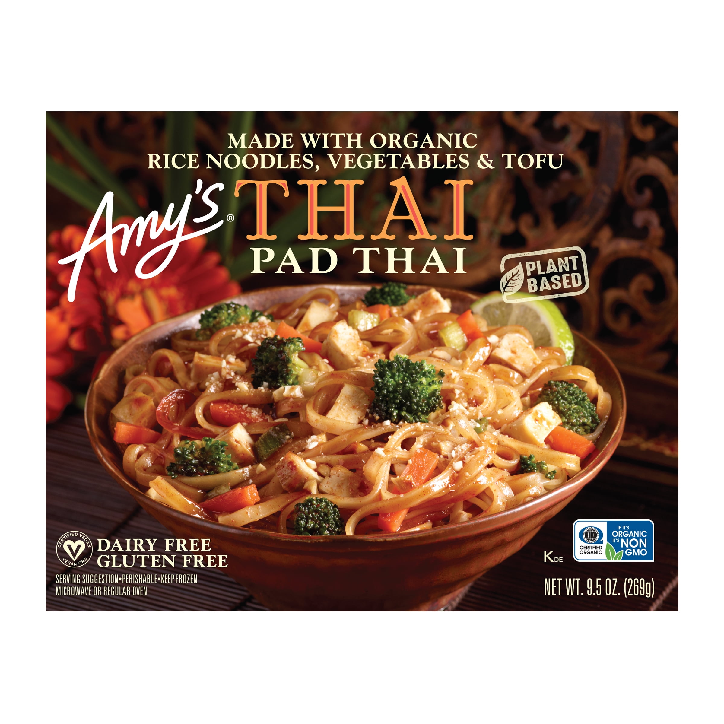 Amy’s Pad Thai is made with organic, broad rice noodles, house-made tofu, julienned carrots, green onions, broccoli and baked cashews, rather than the typical peanuts. Simple, tasty and easy to prepare, this Amy’s Pad Thai contains soy and tree nuts, protein (12g), non GMO ingredients, and is gluten free and dairy and lactose free. It is also suitable for vegan diets.At Amy?s Kitchen goodness is our guiding principle. Since 1987, we at Amy?s Kitchen produce delicious, organic convenient foods for people who are sometimes too busy to cook. Amy?s is a family-run business, and we supervise every aspect of our business and take pride in customer satisfaction. All the fruits, vegetables and grains we use are grown without the use of insecticides, GMOs and other harmful chemicals. We prepare these ingredients with the same careful attention in our kitchen as you would in your own home for high-quality, home-style vegetarian and vegan meals. No meat, fish, shellfish, poultry, eggs or peanuts are ever used in any Amy’s products. Even though you’re heating up our meals in your home, we want each bite to taste like you’re a guest in ours.