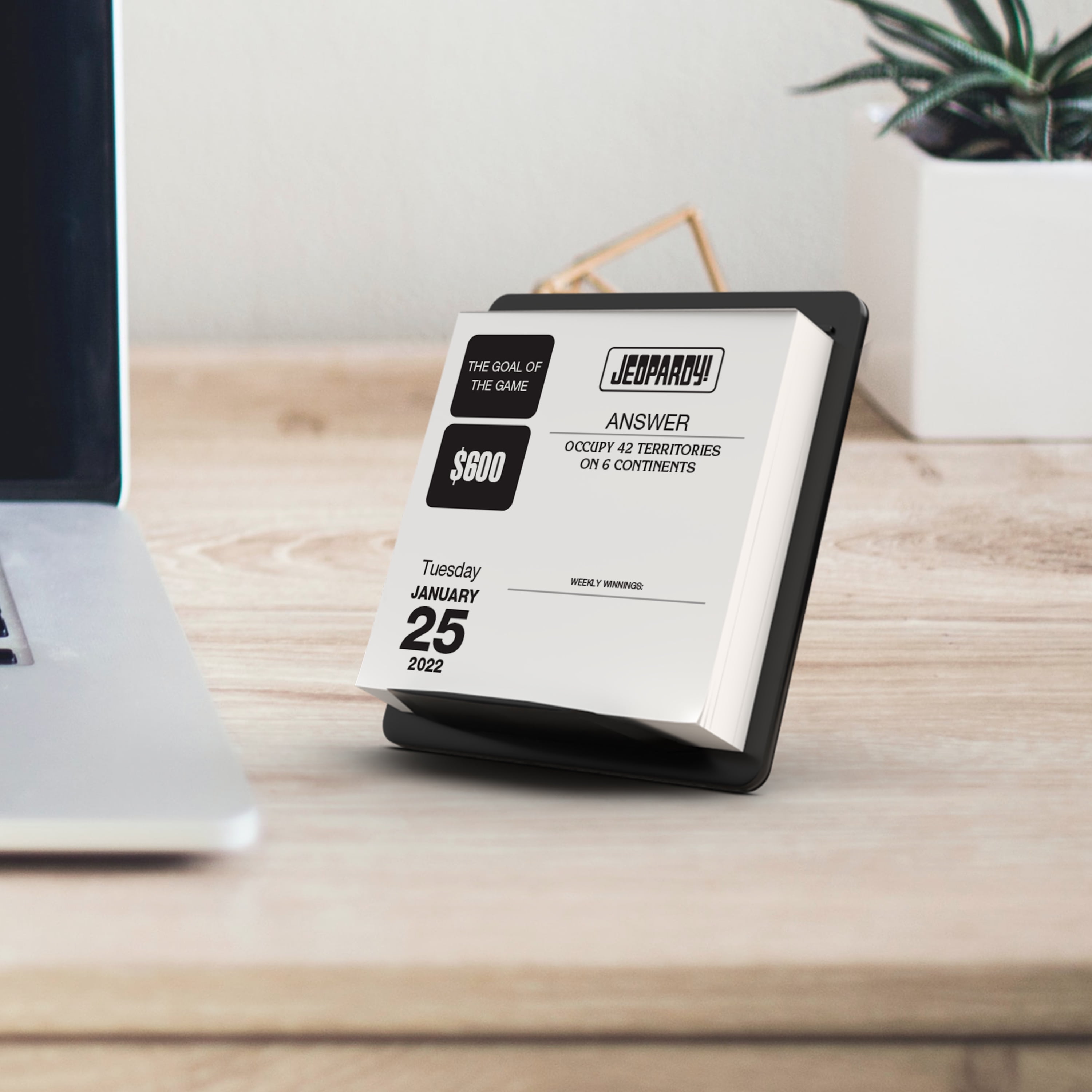 Based on the hit TV show, the Jeopardy! 2022 Calendar will keep any game show enthusiast informed and entertained throughout the year. The calendar follows the familiar answer-and-question format that has made Jeopardy!, America’s Favorite Quiz Show, a household name. It features Jeopardy! And Double Jeopardy! Clues with assigned dollar amounts and a Final Jeopardy! Round where players can wager all or part of their "winnings." The clue is printed on the front of each page and the correct response is printed on the back.