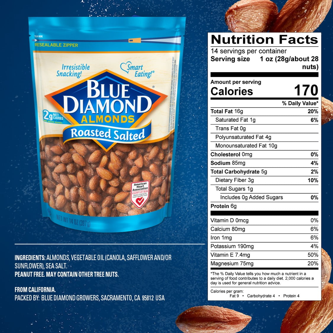 Blue Diamond Almonds Roasted Salted. Almonds, as part of a diet low in saturated fat and cholesterol may reduce the risk of heart disease. Almonds are calorie smart and free from cholesterol & peanuts. Rich in antioxidant vitamin E.Blue Diamond Almonds Roasted Salted. Irresistible snacking!. Smart eating!. 2g Net carbs per serving. American Heart Association Certified. Scientific evidence suggests, but does not prove, that eating 1.5 ounces per day of most nuts, such as almonds, as part of a diet low in saturated fat and cholesterol may reduce the risk of heart disease. Net Wt 14 oz (397 g).