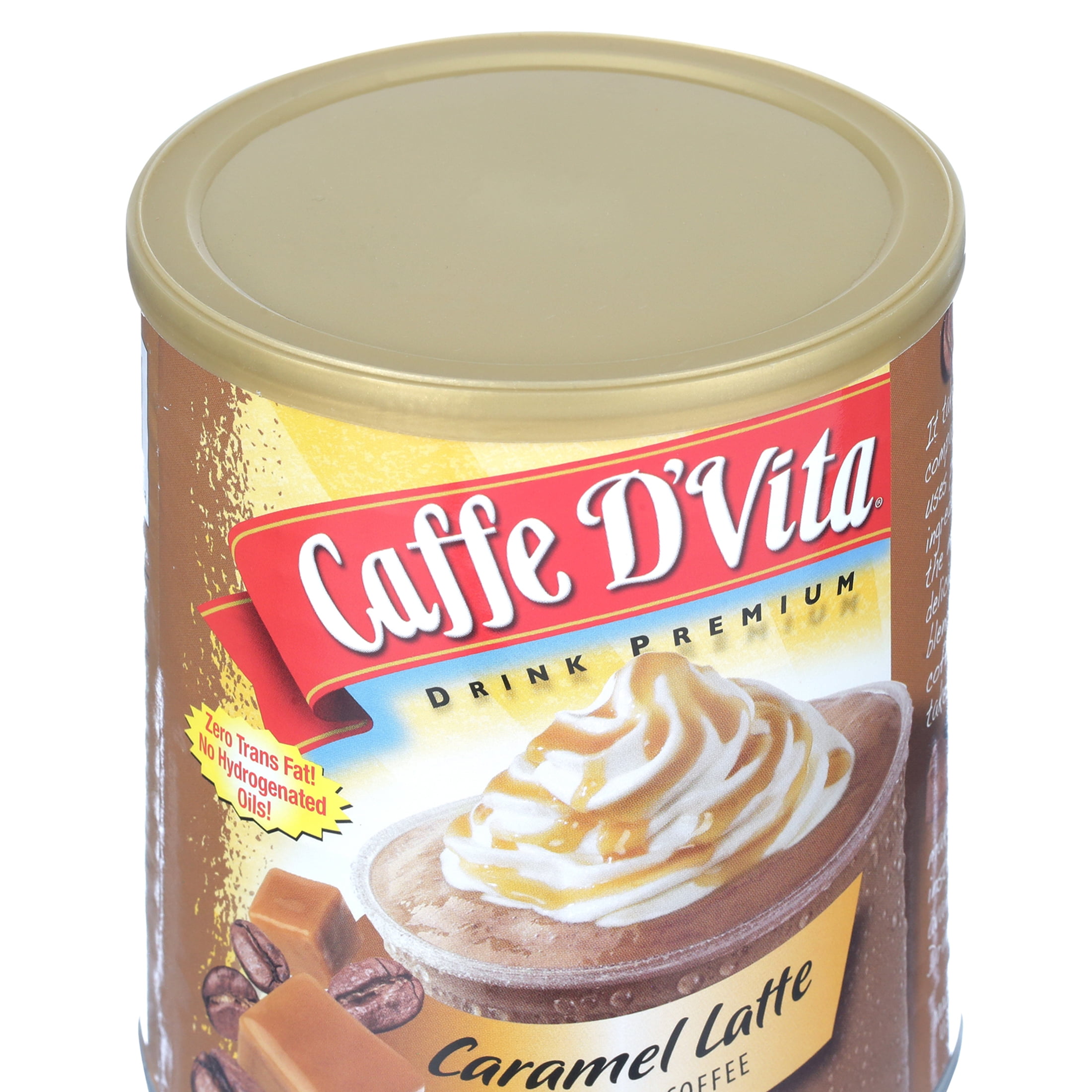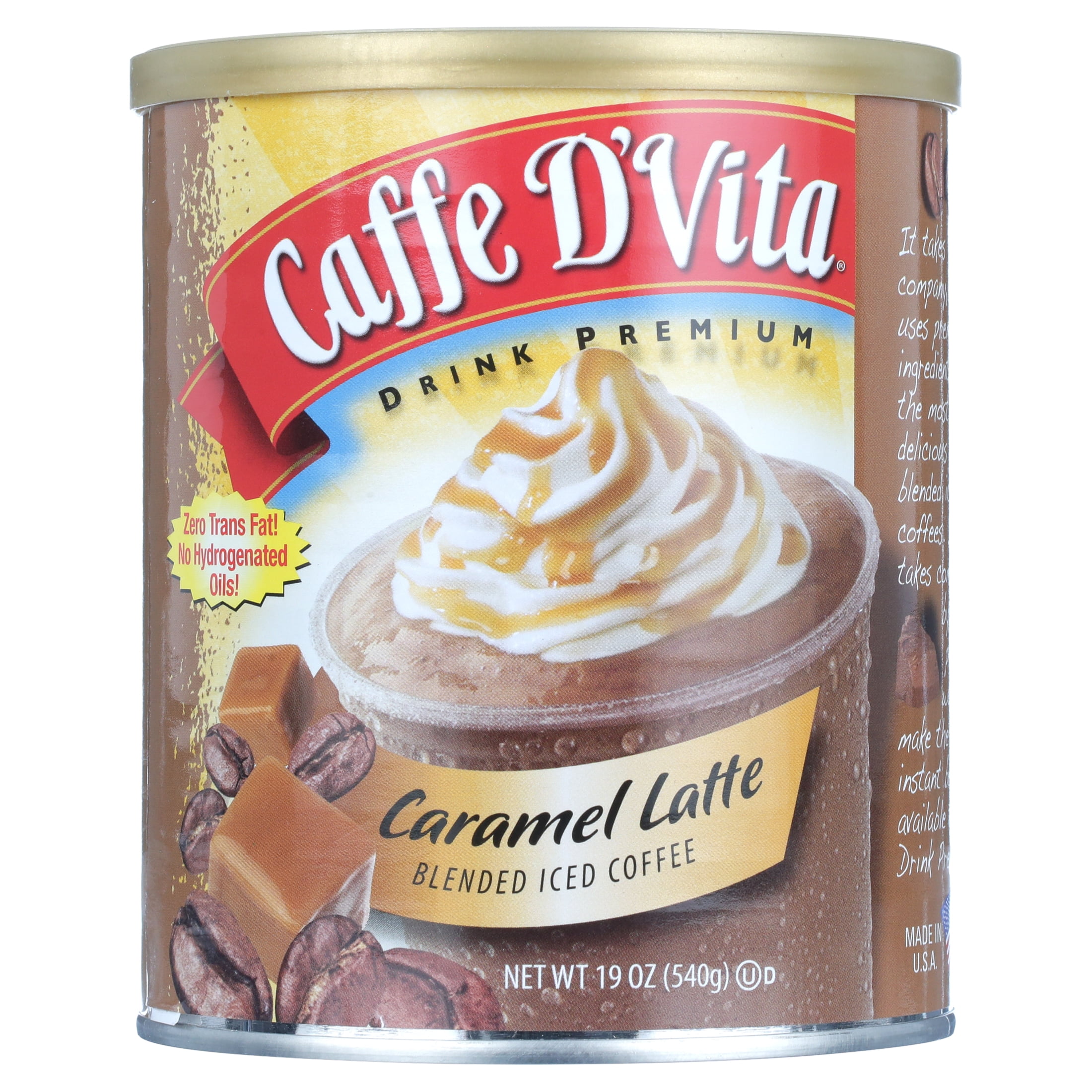 6 – 19 oz canisters of Caffe D’Vita Caramel Latte Blended Iced Coffee Mix. Since 1974 Caffe D’Vita has been the leader in instant cappuccino and other beverage mixes. Using only the finest ingredients, Caffe D’Vita creates amazing flavor combinations for instant frappes and blended iced coffees in your home. Now enjoy Caffe D’Vita Caramel Latte Blended Iced Coffee with the rich flavor of coffee plus sweet caramel in every sip. No need for expensive machines or bulky and complicated equipment cluttering your counters. No need to pay coffee house prices or sit in long drive-thru lines for your favorite frappe. Just blend up Caffe D’Vita Caramel Latte Blended Iced Coffee at home any time of the day or night. Just add water or any type of milk to our powder mix and ice cubes to create an amazing frappe at home. Try it alone or with syrups or liquors for a one-of-a-kind blended drink.