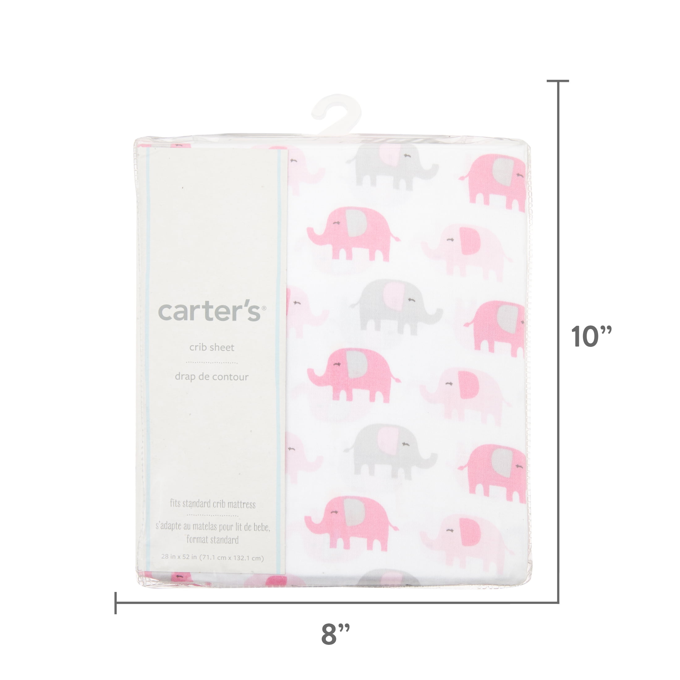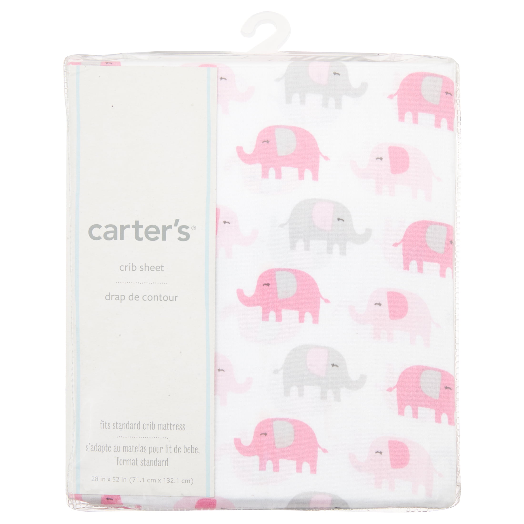 Carter’s The Perfect Baby Basic Every Nursery Needs. Makes a great Baby Shower Gift!Carter’s – Sateen Crib Sheet – Pink Elephant Print, Colors are Pink & Grey. All-over print is white with pink and grey elephants. Baby will drift away to dreamland with Carter’s sateen fitted crib sheets. Provides extra softness for your baby’s cozy comfort and is featured in beautiful decor colors and prints. Fits a standard size crib mattress 28" x 52". Made of 100% Cotton Sateen Fabrics. Perfect Baby Basic Every Nursery Needs!