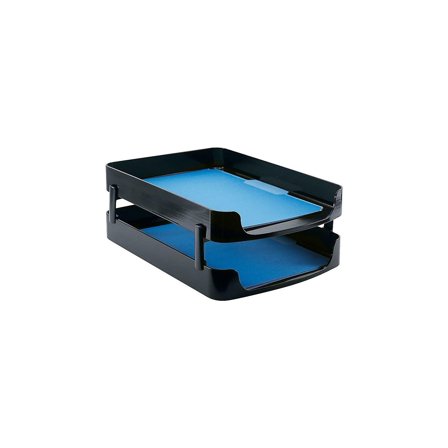 Letter tray features a contemporary design to harmonize with nearly any style of office. Wide frontal cutout provides easy access to your papers for quick removal. Shock-resistant polystyrene withstands minor mishaps and daily use for long-lasting organization. Space-saving design can be stacked vertically or positioned in a staggered formation for multiple placement options on your desktop. Plus, add four optional risers (sold separately) to double your storage capacity.