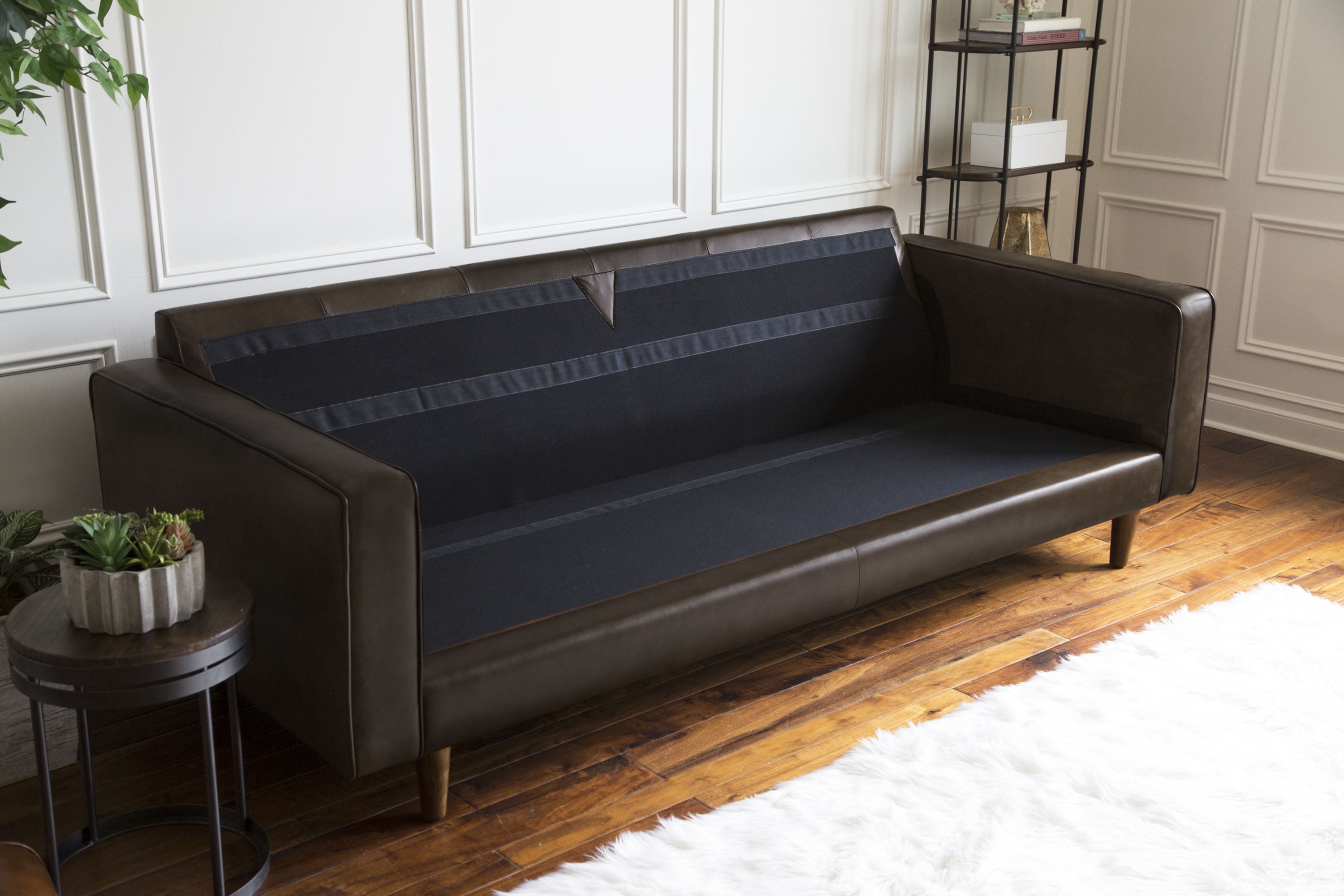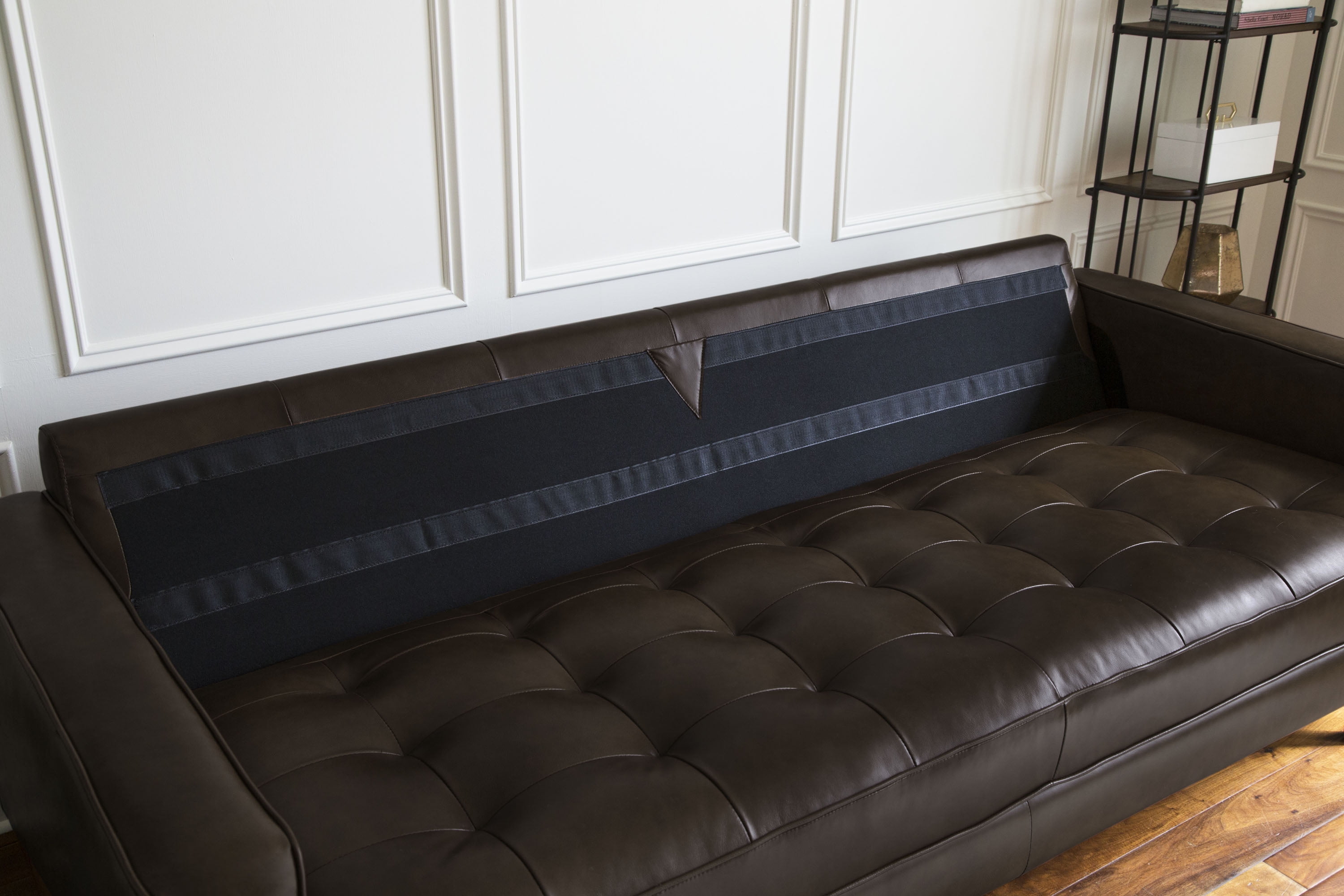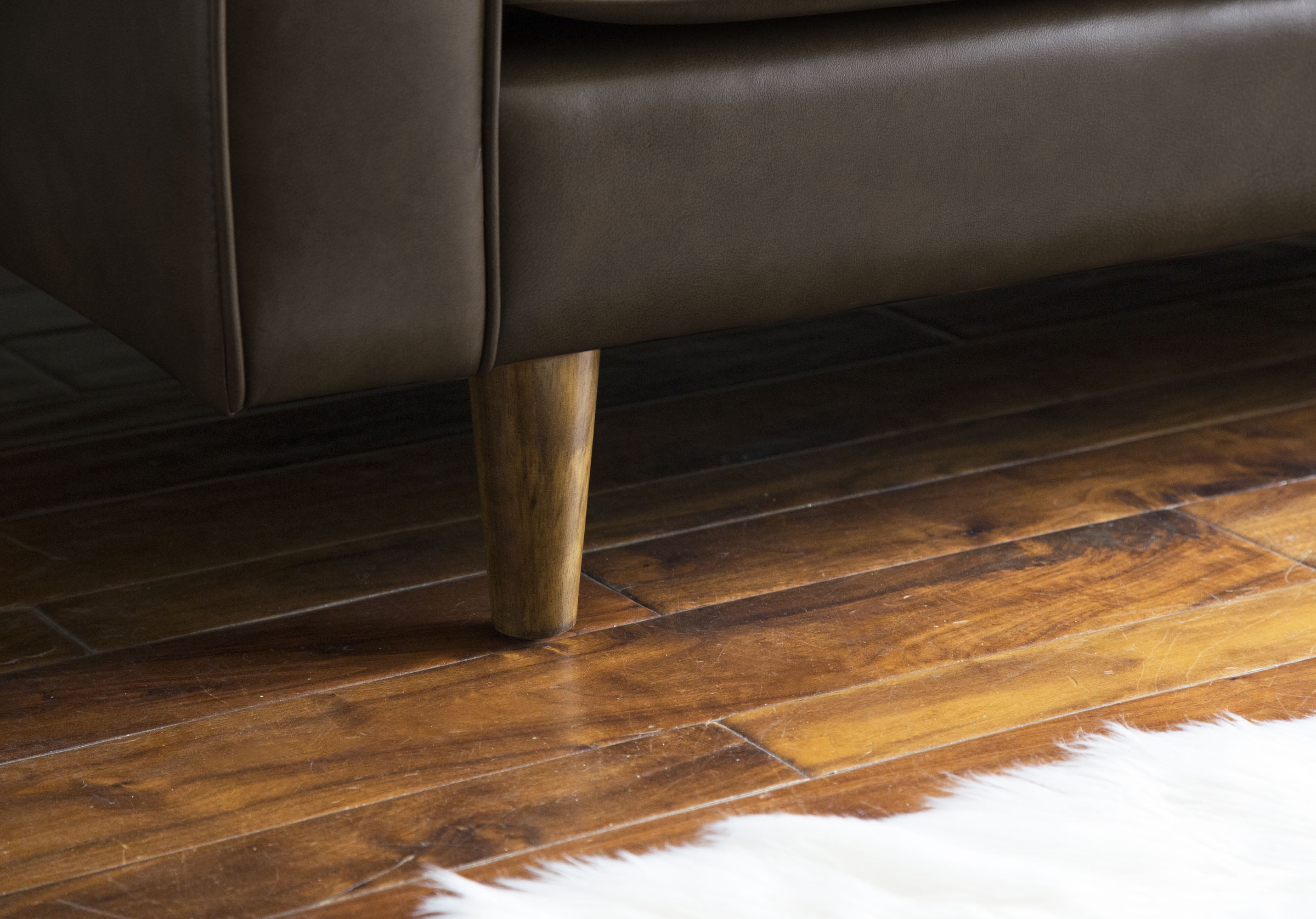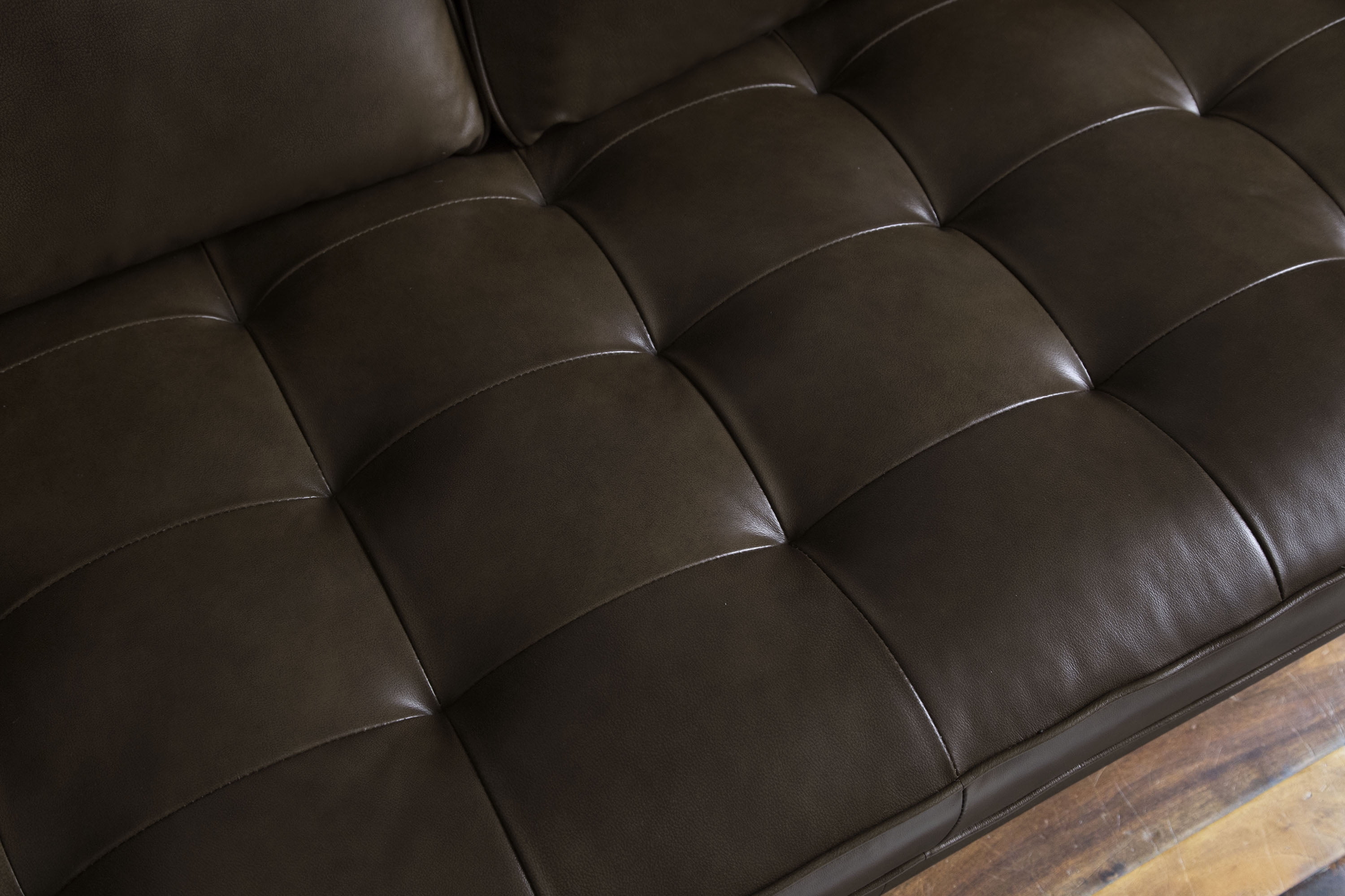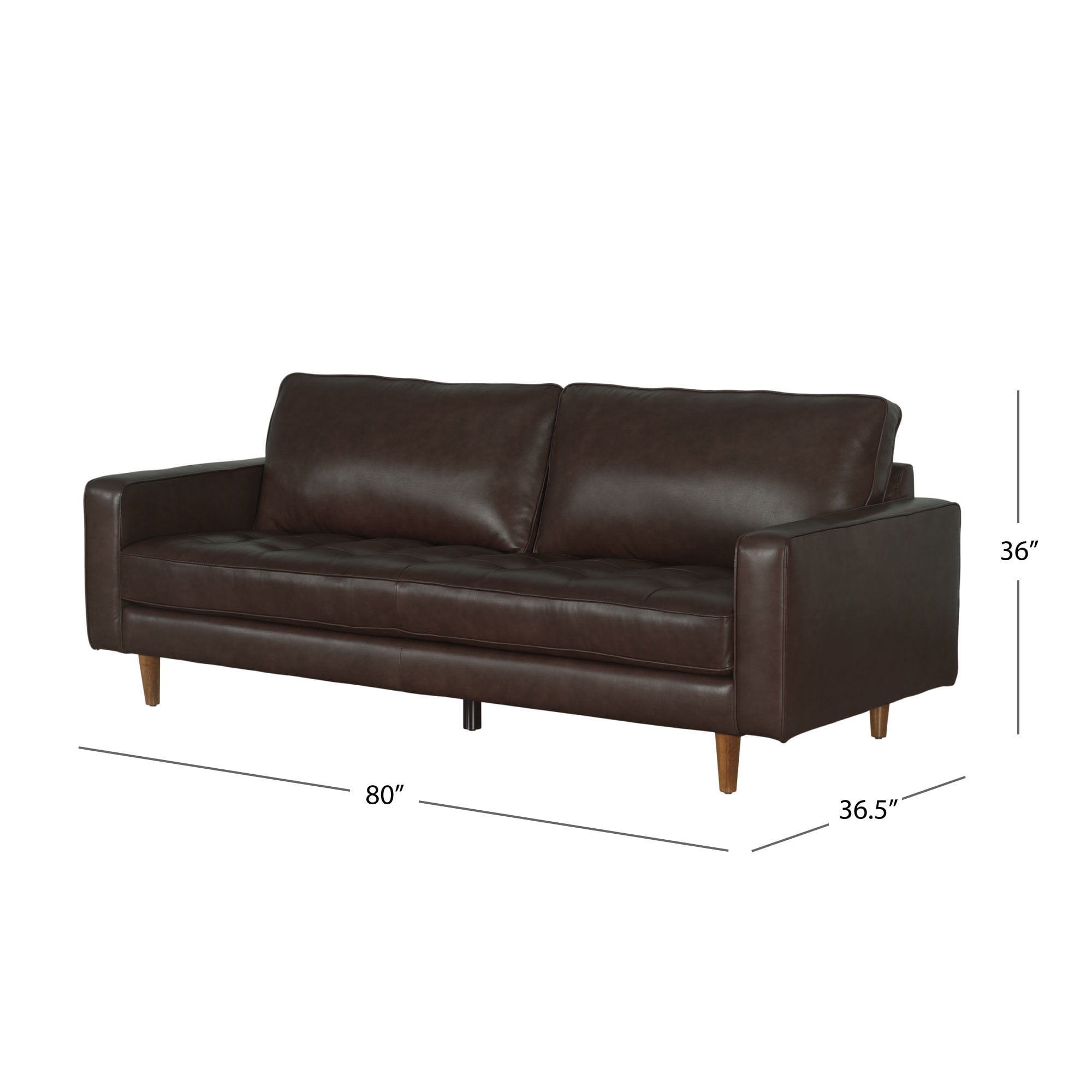 Capture the timeless mid-century style in all the new Lorena Leather Sofa by Devon & Claire. This piece is upholstered in high-quality top grain leather and filled with high-density foam for a soft touch and a comfortable seat. A thick style seat cushion provides plush comfort, while the pillow back adds a handsome finishing touch to the piece. The solid-wood frame and tapered legs provide a natural look and lasting durability.