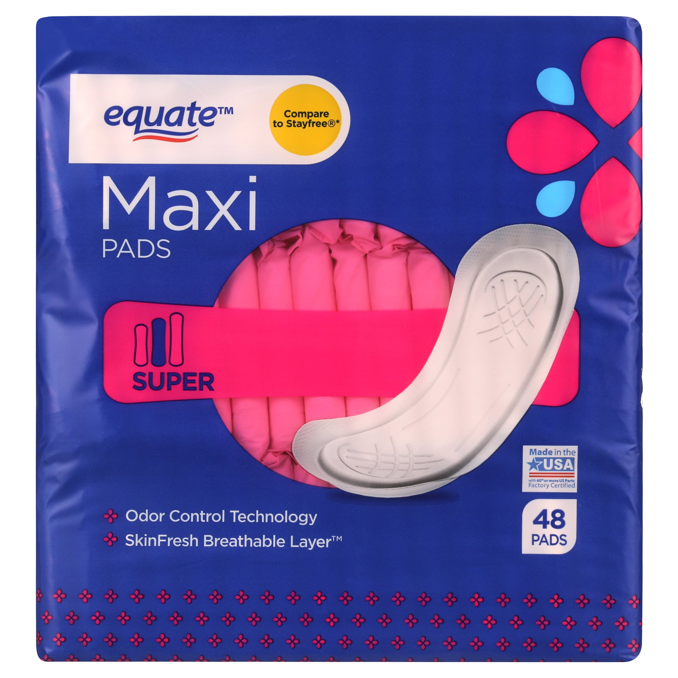 Stock up and stay comfortable all day with these Equate Super Maxi Pads. These pads have a skin fresh breathable layer that allows you to stay fresh and dry providing you with all day comfort. The cotton-soft cover offers extra comfort and protection, and the absorbent core is designed to keep you dry and confident. The Omni-Odor Guard helps control odors, and the profiled shape helps to make a secure and comfortable fit. The box contains six packs of 48 pads. Equate pads help you have a comfortable and healthy period. The simple choice for periods is Equate Super Maxi Pads. Making the right health decisions can be challenging. With a complete range of products and simple solutions, Equate allows you to take care of your family with confidence.