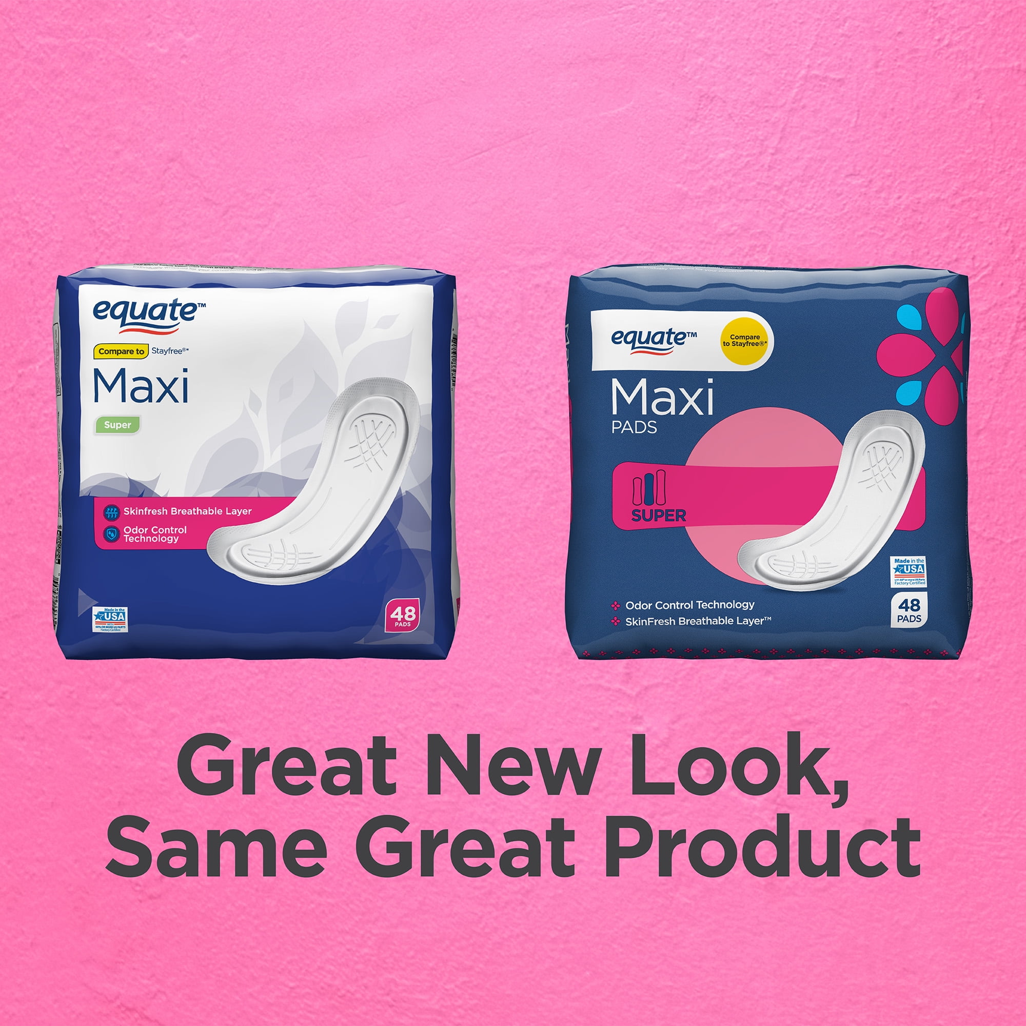Equate Maxi Pads with Flexi-Wings, Extra Heavy Overnight stops leaks up to 10 hours with the help of three layers of protection. These maxi pads have a skin fresh breathable layer that allows you to stay fresh and dry providing you with all day comfort. The absorbent core allows you 10 hours of worry free protection and has a cotton enhanced layer that wicks away moisture for healthy skin. Perfect for your postpartum needs. They come individually wrapped for convenient and discreet access in your purse, gym bag, or cosmetic bag. Equate maxi pads have many qualities that help you have a comfortable and healthy period. The simple choice for periods is Equate Maxi Pads with Flexi-Wings, Extra Heavy Overnight. Making the right health decisions can be challenging. Equate allows you to take care of your family with confidence.