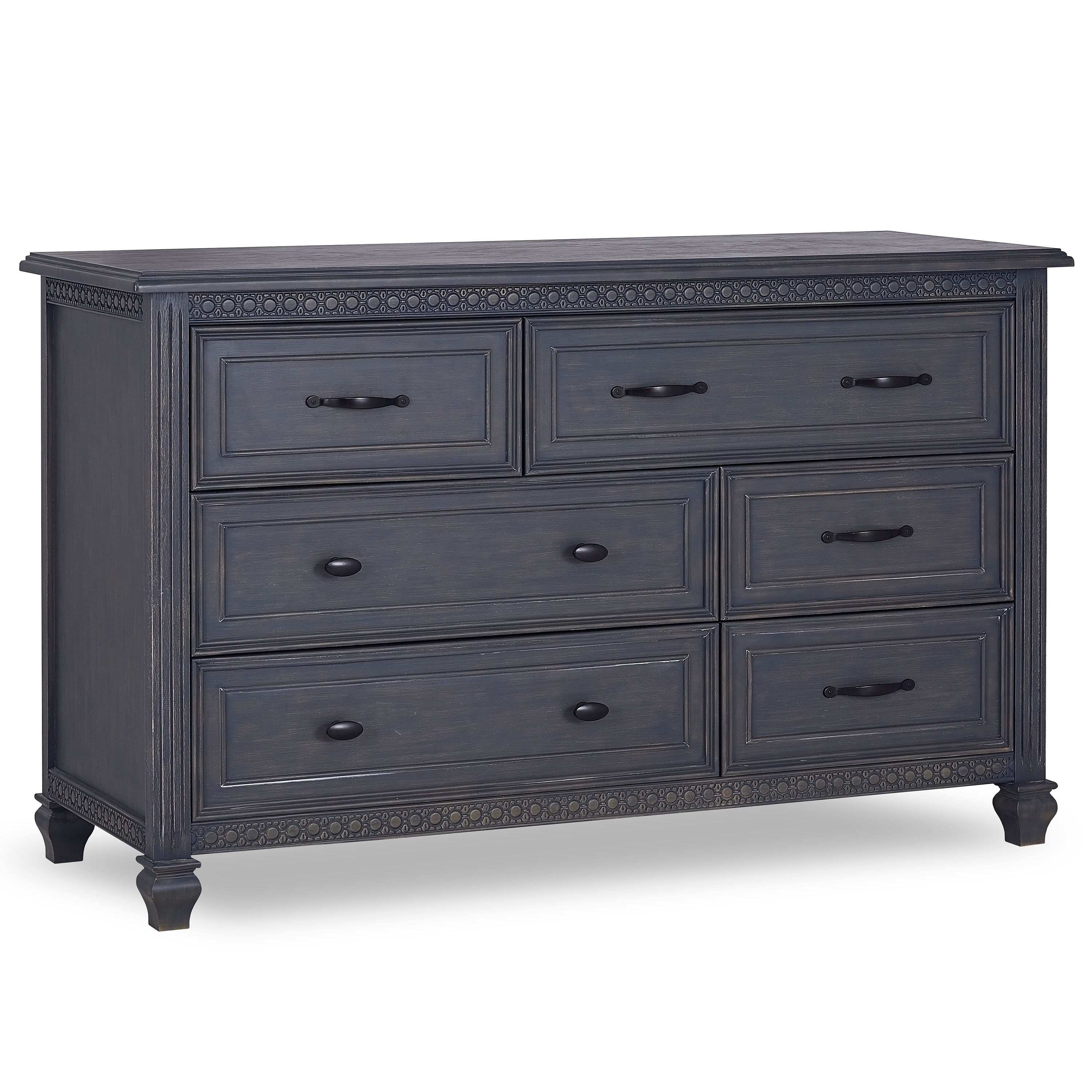 Though the world travels of our designers, the Madison collection was designed in the charming small French town, Dinan. The 13th century architecture, magnificent ramparts, tall arched bridge and picturesque colors crafted the inspiration for this collection.Inspired by a shabby chic meets rustic farmhouse design, this versatile double dresser adds an rustic sophistication to any nursery. The Evolur Madison dresser is designed with exquisite art deco inlay trim, fluted legs, molding, routing lines which is perfect for traditional or shabby chic inspired nurseries, where luxury and ambience are essential. The dresser features an arch drawer pulls and quality side-mounted 3 tier glides to help provide durability over the years with its quality material, craftsmanship and its forward-thinking functionality. This double dresser can serve as a changing surface by adding a contour pad (sold separately).