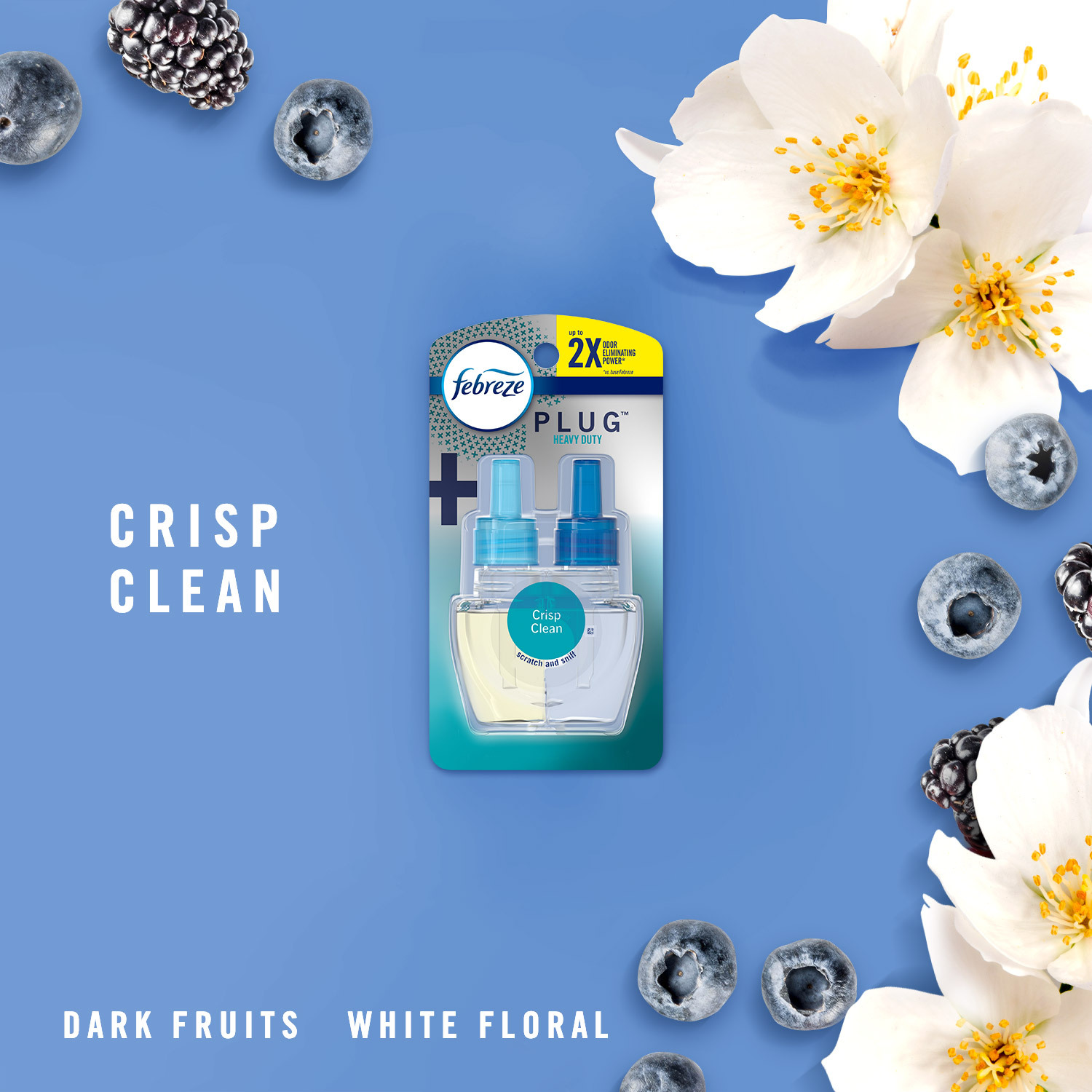 - Get 2X the odor-eliminating power and freshness with the invigorating scent of Heavy Duty Crisp Clean (vs. base Febreze)