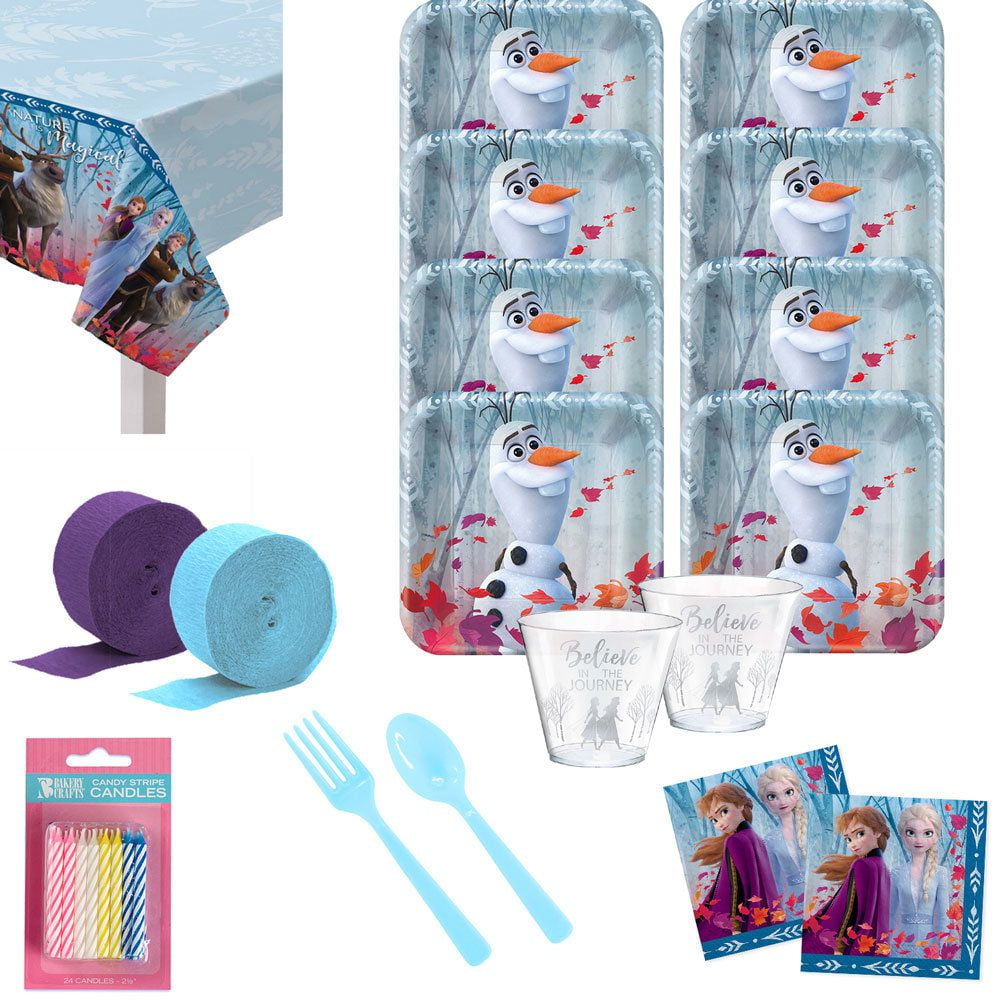 Your little one will love having Frozen 2 Deluxe Tableware Kit (Serves 8) for their Frozen party! Includes Lunch Napkins (16) Dessert Plate (8) 9 oz. Cup – Purple (8) Forks & Spoons Plastic Tablecover 54 x 84 (1) 2 Crepe Paper Streamers Assorted Birthday Candles (24)Frozen 2 Deluxe Tableware Kit (Serves 8)