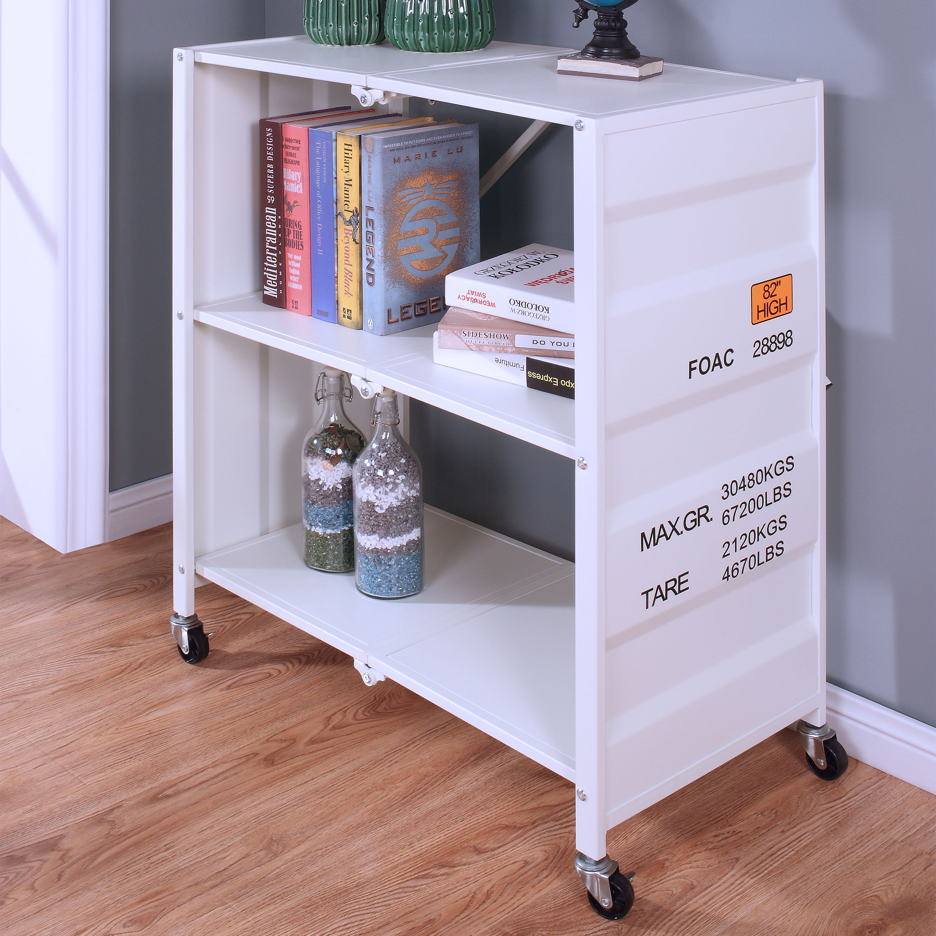 An industrial white folding bookcase delivers two shelves for ample storage and is adorned with fun accents and features steel construction. It delivers charm with decorations and a choice of finish colors that add authenticity to its overall design. The ingenious design folds for optimal versatility and it includes casters on its base that ensure it’s easy to move from one place to another.