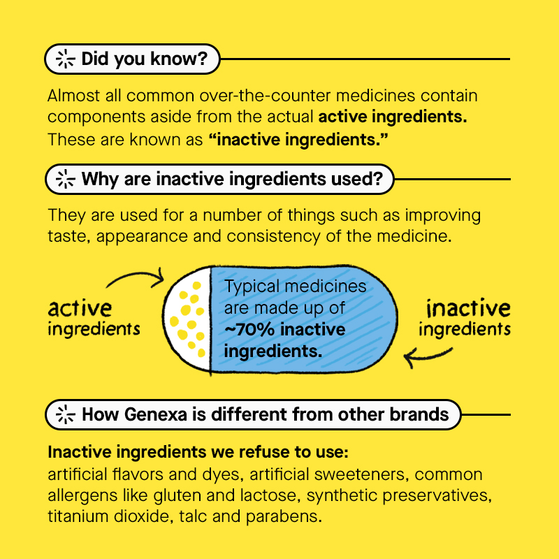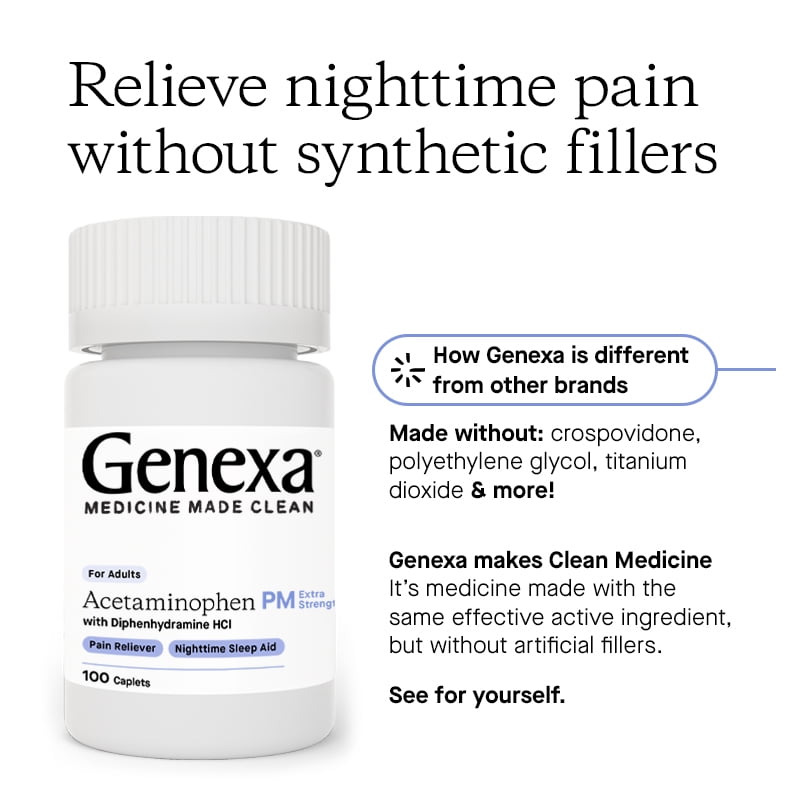 Genexa Pain & Fever PM Acetaminophen & Sleep Aid temporarily relieves occasional headaches and minor aches and pains, along with accompanying sleeplessness. Both a temporary pain reliever and nighttime sleep aid, each caplet contains 500 mg of acetaminophen for pain relief and 25 mg of diphenhydramine HCI for nighttime sleep aid. These temporary pain relief caplets are formulated for use by adults as well as children 12 years and over. All Genexa products are free of artificial preservatives, artificial dyes, parabens, and common allergens. Founded by two dads who believe in putting People Over Everything®, Genexa makes medicine with the same active ingredients people need, but without the artificial ones they don’t. It’s real medicine, made clean.