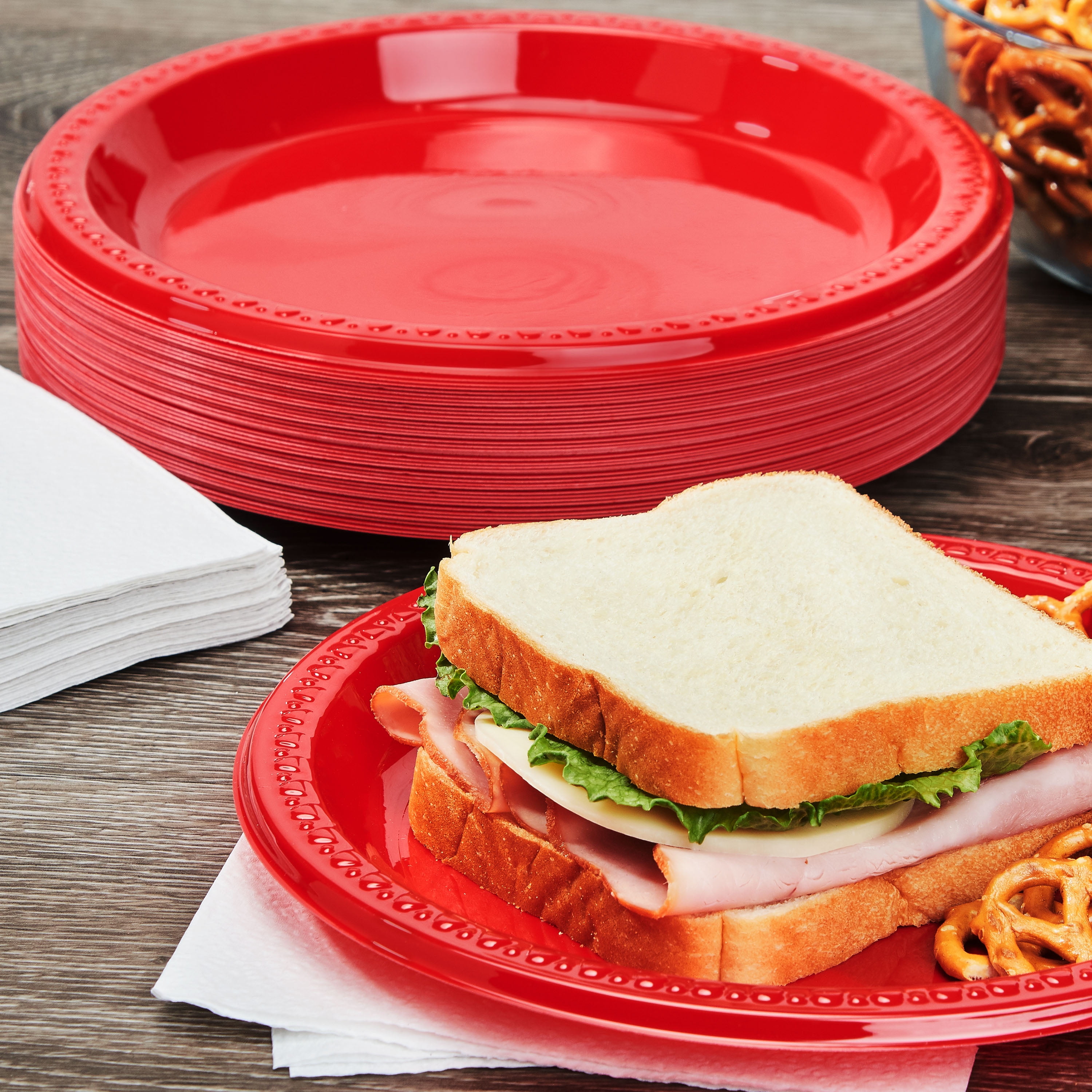 Great Value Plastic Plates are durable practical and come in a stylish vivid red. These cut-resistant plastic plates are easy and disposable when you don’t need the hassle of cleaning up. Confidently serve or enjoy all of your favorite main courses and their complementary side dishes on these sturdy plates that can stand up to even the heartiest meals. Toss them in your trunk for quick and easy meal prep when you’re on the go or have them on hand in the pantry for everyday mess-free meal serving. Convenient for both hot and cold foods these plates come in a generous pack of 50 and are a great option for backyard barbecues office parties birthday parties picnics graduations or any other events or get-togethers when you want an easy clean-up. When you need reliable colorful tableware for your next special occasion stock up on Great Value Plastic Plates. Great Value products provide families with affordable high-quality grocery and household consumable options. Our wide range of product categories spanning grocery and household consumables offers you a variety of products for your family’s needs. Our products are conveniently available online and in Walmart stores nationwide allowing you to stock up and save money at the same time.