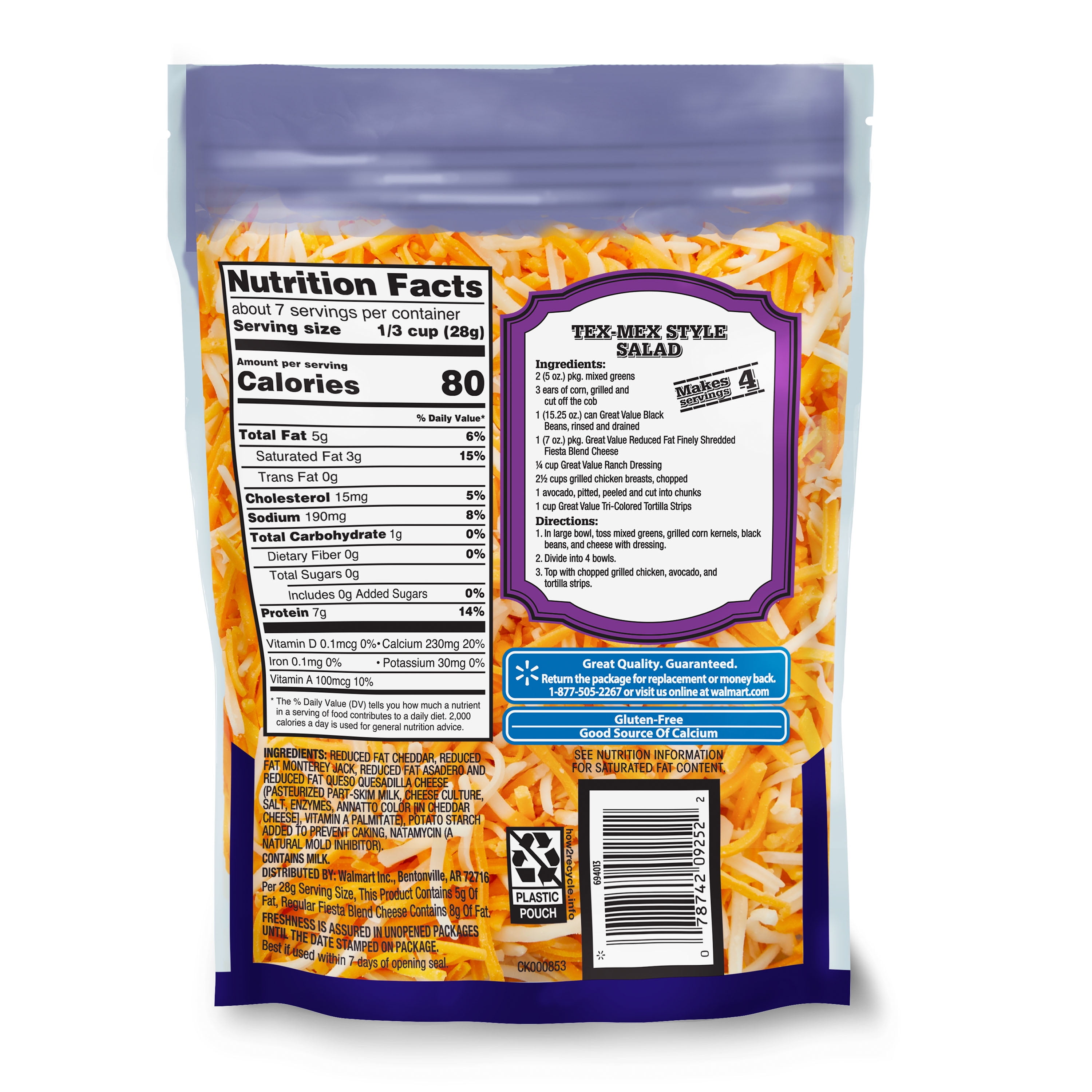 Great Value Finely Shredded Reduced Fat Fiesta Cheese Blend is made with a combination of Monterey jack, cheddar, queso quesadilla and asadero cheeses that are finely shredded for your convenience. This cheese blend is perfect for multiple uses making it a great item to keep on hand in your refrigerator. Use it in casseroles, soups, sandwiches, omelets, quesadillas, tacos, enchiladas, macaroni, pastas, pizza and much more. Follow our delicious Tex-Mex Style Salad recipe idea located on the back of the packaging. This reduced fat shredded cheese offers nutritional benefits as it is a great source of protein and calcium. It is also gluten-free which is great for individuals who are sensitive to gluten. Transform weeknight family meals into a fiesta with Great Value Finely Shredded Reduced Fat Fiesta Cheese Blend.