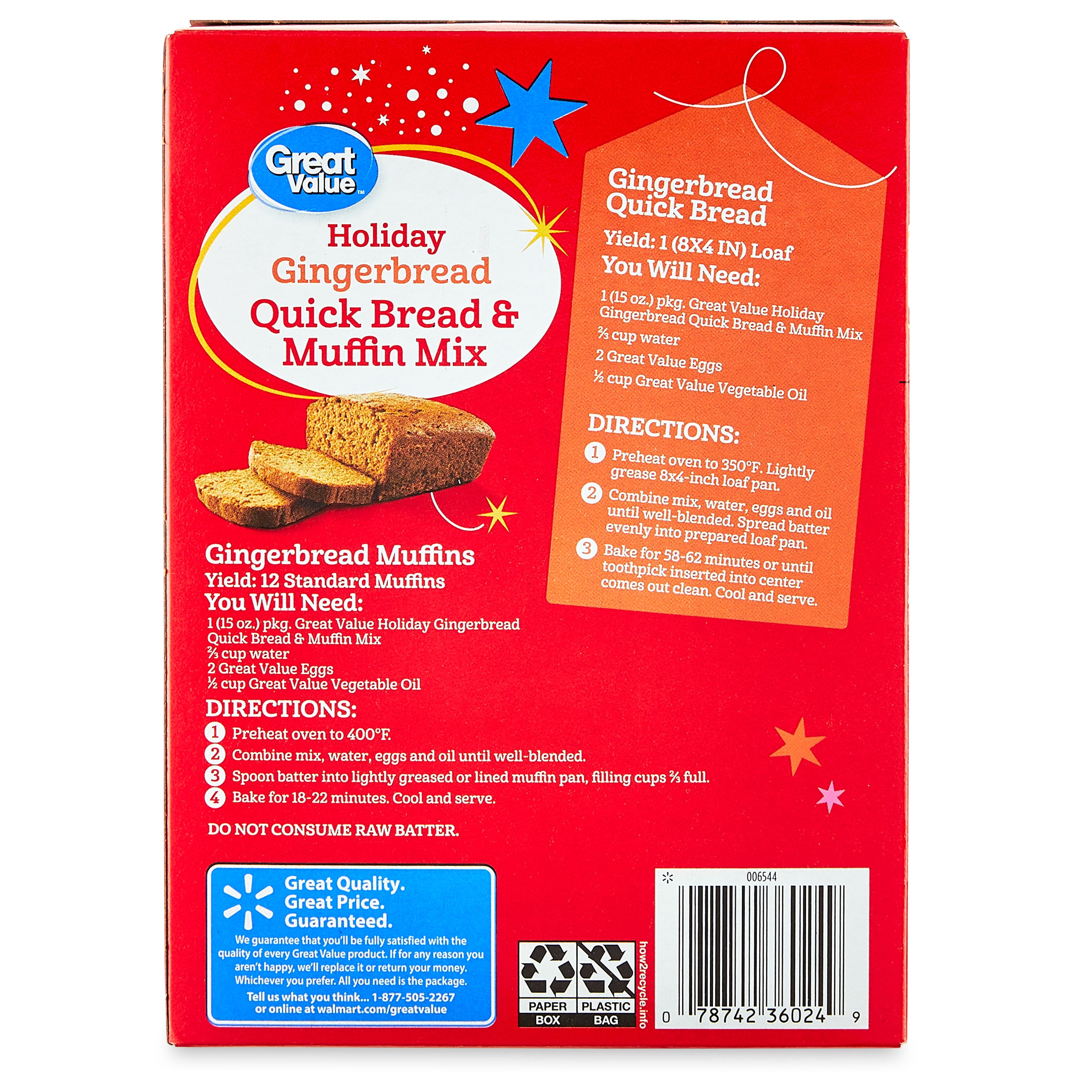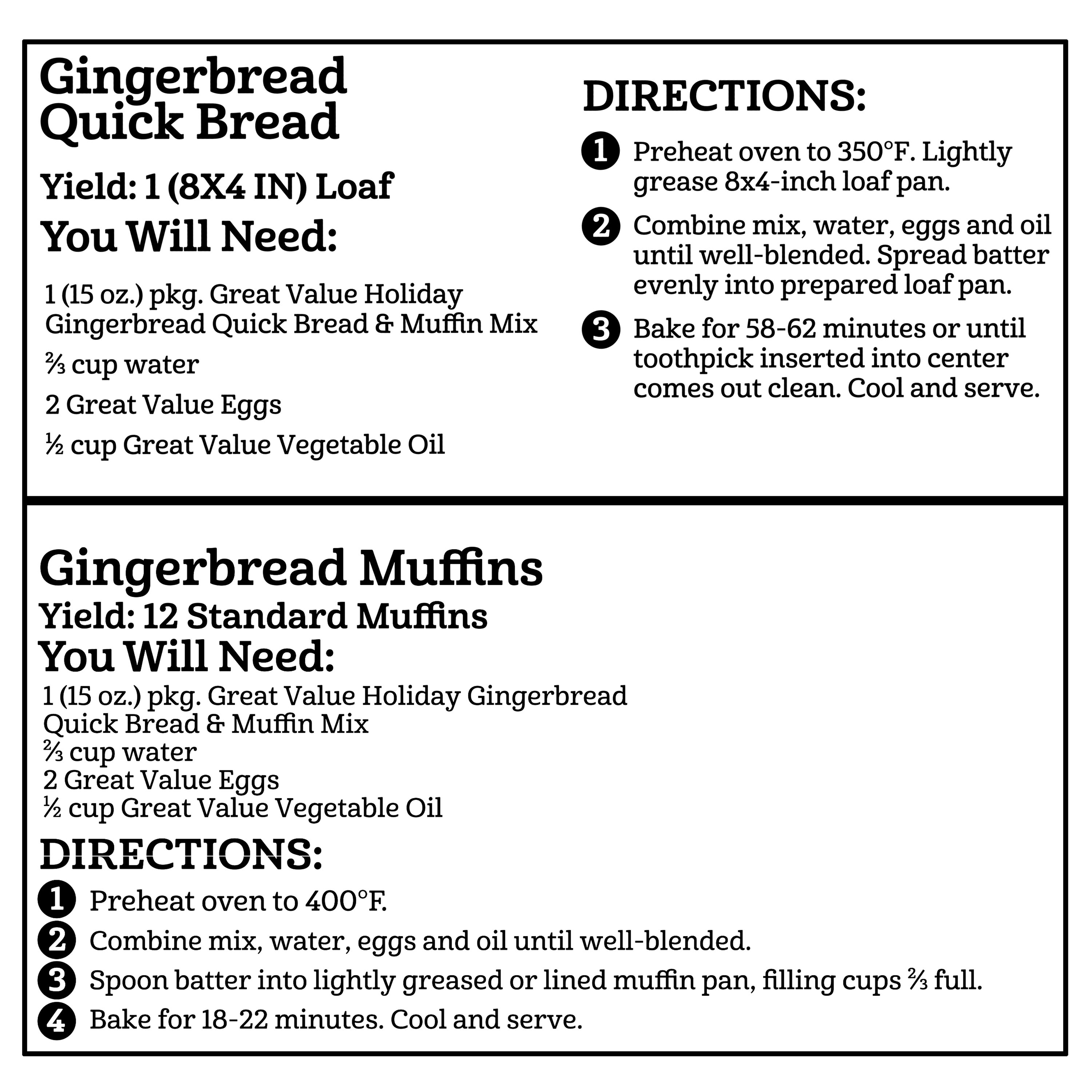 Savor the flavors of the season with Great Value Holiday Gingerbread Quick Bread and Muffin Mix. With this convenient mix, you can make a loaf of freshly baked bread or 12 delicious muffins. Eggs, vegetable oil, water, and this box of mix are all you need to bake comforting and seasonal bread or muffins. Serve the bread at your next dinner party or bake the muffins for a special family breakfast. Enjoy the comforting flavors of winter with Great Value Holiday Gingerbread Quick Bread and Muffin Mix.