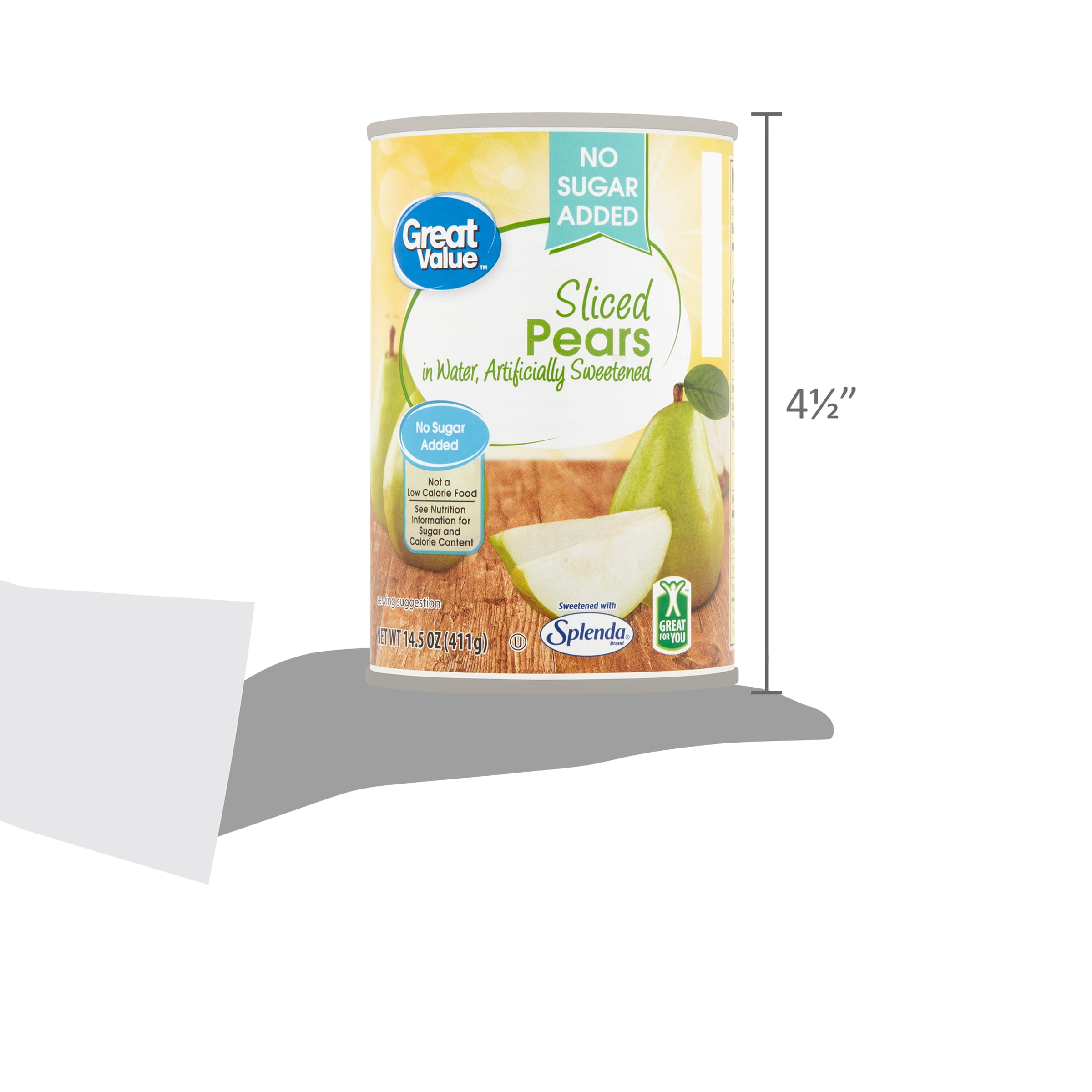 Enjoy the sweet and juicy flavor of sliced pears inside every can of Great Value No Sugar Added Sliced Pears. Pears are known to contain a hefty amount of potassium and the healthy antioxidant vitamin C and may also help control blood sugar levels. Our mouth-watering pears have absolutely no added sugars, fat, sodium, or cholesterol, and only contain 40 calories per ½ cup serving, making them an excellent choice for the health-conscious consumer. Put a few of our sliced pears into a bowl for a quick snack at work or school or get creative in the kitchen and use them in some of your favorite recipes. Whip up a delicious cobbler, crisp, or upside-down cake, or simply eat them right from the can with a drizzle of honey and sprinkle of cinnamon. Great Value No Sugar Added Sliced Pears are a versatile, wholesome, and delicious treat you can enjoy anytime.Great Value products provide families with affordable, high quality grocery and household consumable options. With our wide range of product categories spanning grocery and household consumables, we offer you a variety of products for your family’s needs. Our products are conveniently available online and in Walmart stores nationwide, allowing you to stock up and save money at the same time.Great Value No Sugar Added Sliced Pears, 14.5 oz: