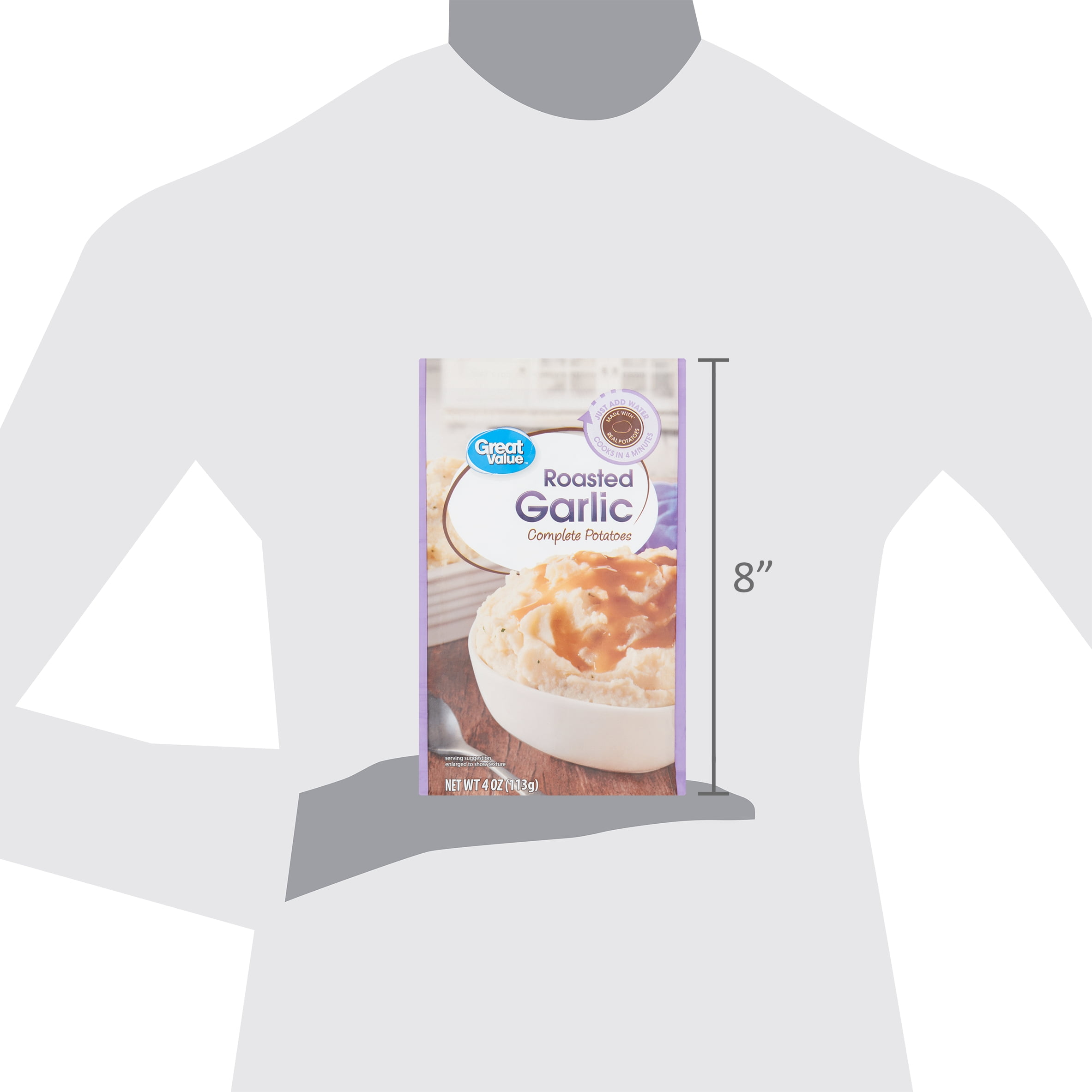 Great Value Roasted Garlic Complete Potatoes are a delicious choice for busy families looking to cook up a dinner in a hurry. Made from real potatoes with zippy garlic flavor added, this instant potato mix just needs water added before heating up, and they can be ready to eat in about 4 minutes. Serve with roast chicken or steak and vegetables for a classic meal the whole family can appreciate. Use the mix for a quick yet delicious side for family cookouts and barbecues. Add a little cheese to these potatoes for an extra tasty addition to your meals. They can be made either in the microwave or on the stovetop in little time. These instant potatoes are also ideal for camping trips or other travels where meal options might be limited. Great Value Roasted Garlic Complete Potatoes will satisfy the whole family.