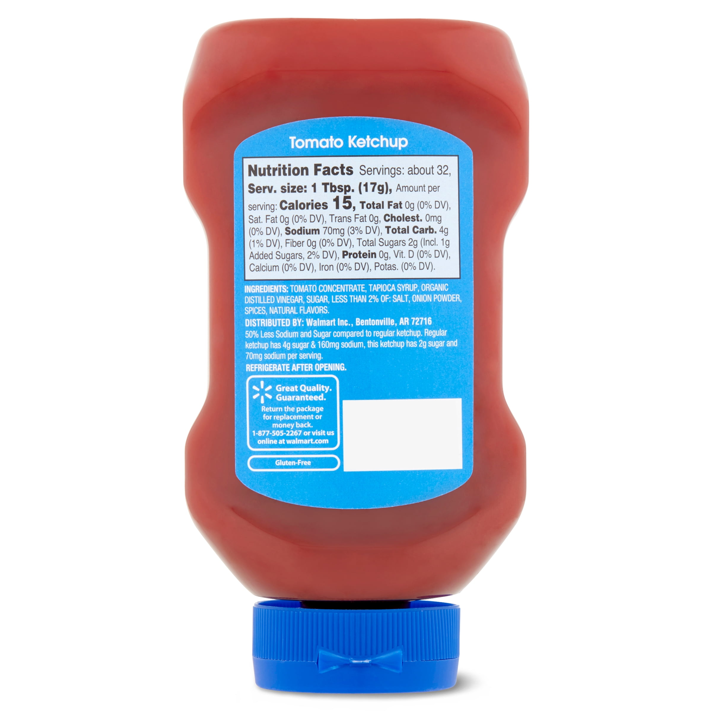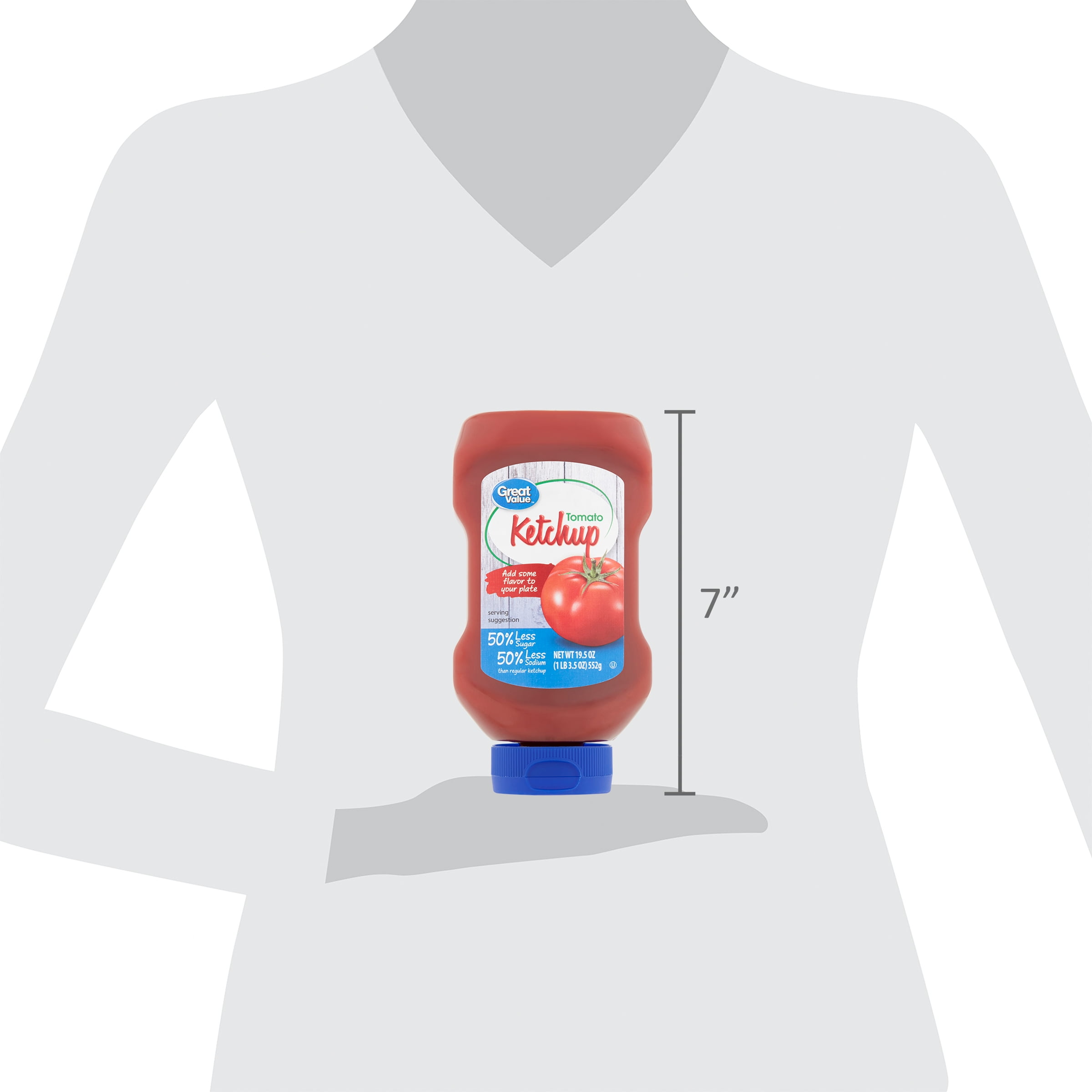 Great Value Tomato Ketchup is a classic condiment that has a thick texture and a delicious rich taste. It has 50 percent less sugar and less sodium than regular ketchup. This ketchup is the perfect topping, dip, or ingredient for your favorite dishes. Use it as a dipping sauce for crispy chicken tenders or crinkle-cut fries. Drizzle it on flame-grilled burgers or hot dogs. Add it to brown sugar and mustard to create a zesty meatloaf sauce. It comes in an easy squeeze, squirt bottle for your convenience. This ketchup contains less sodium than regular ketchup and is also gluten-free. Add some flavor to your plate with the great taste of Great Value Tomato Ketchup.