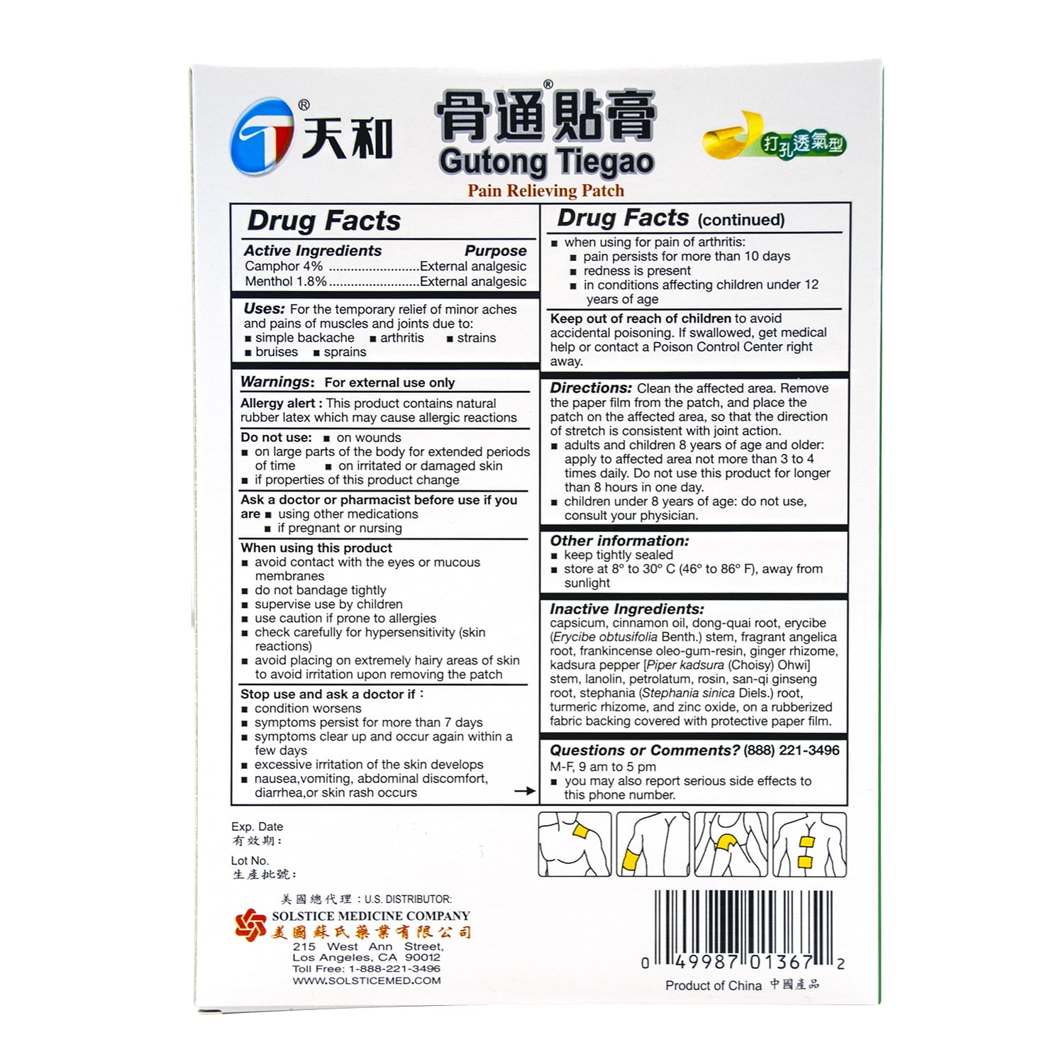 Apply this Chinese herbal medicated patch to temporarily relieve minor aches and pains of muscles and joints due to: simple backache, arthritis, strains, bruises, sprains.GUTONG TIEGAO Pain Relieving Patch (10 plasters)