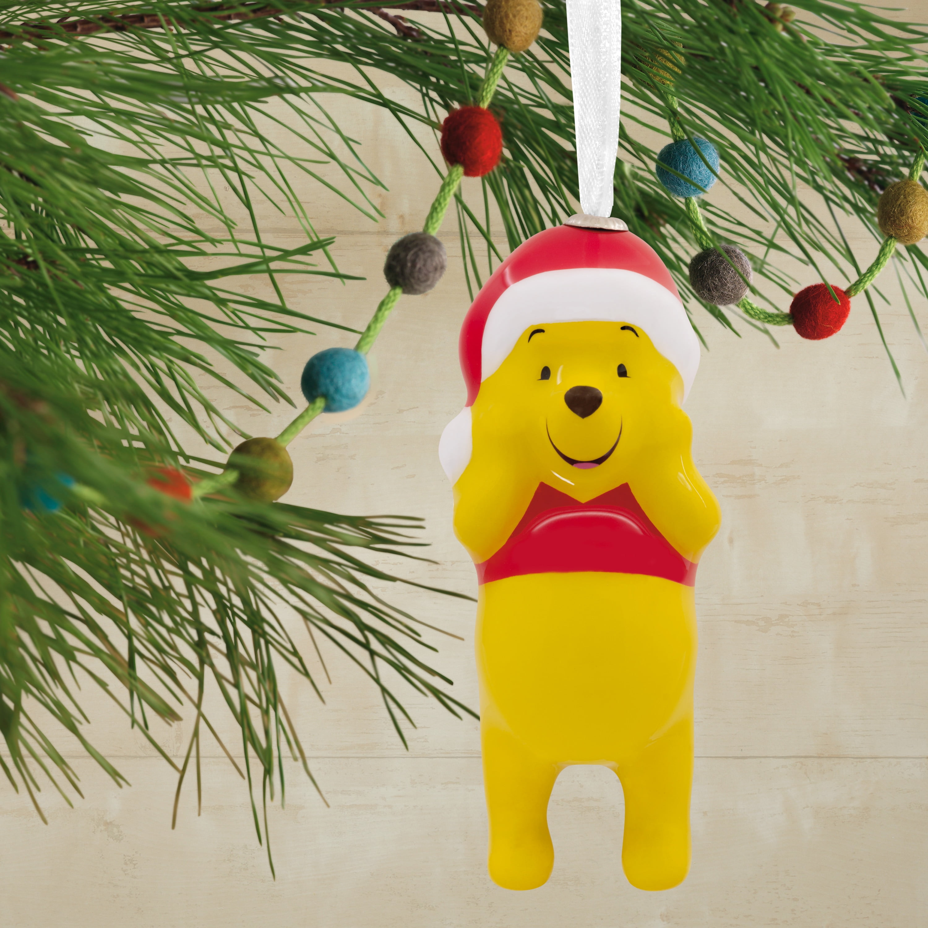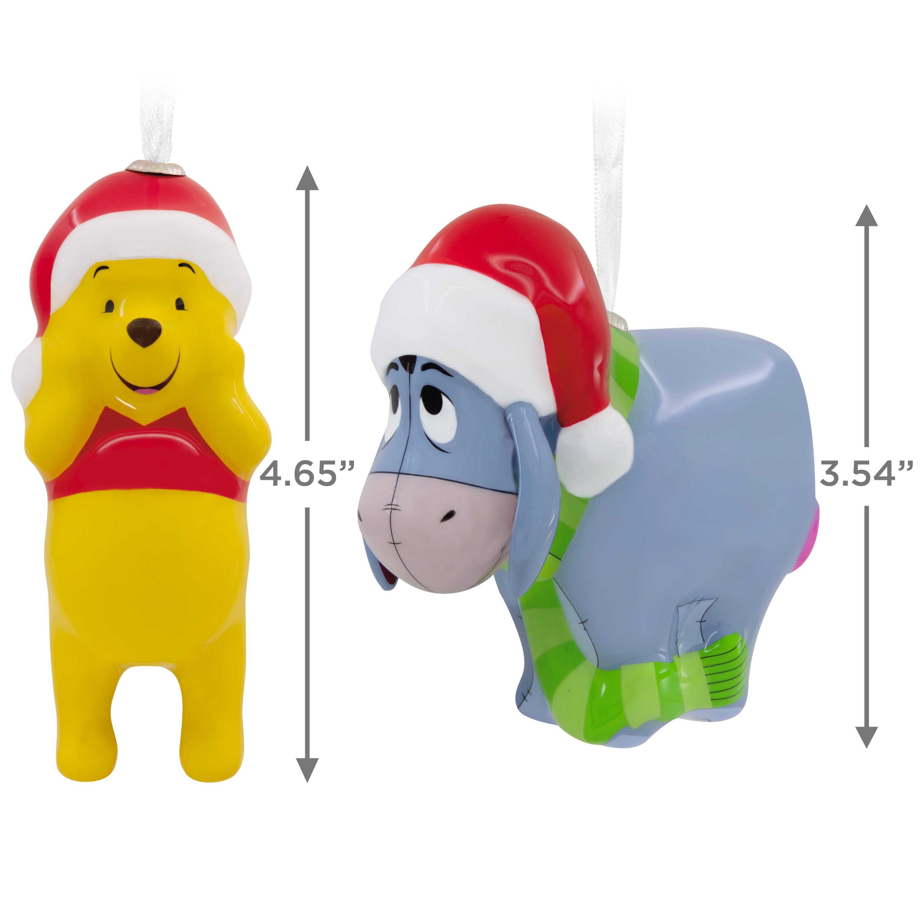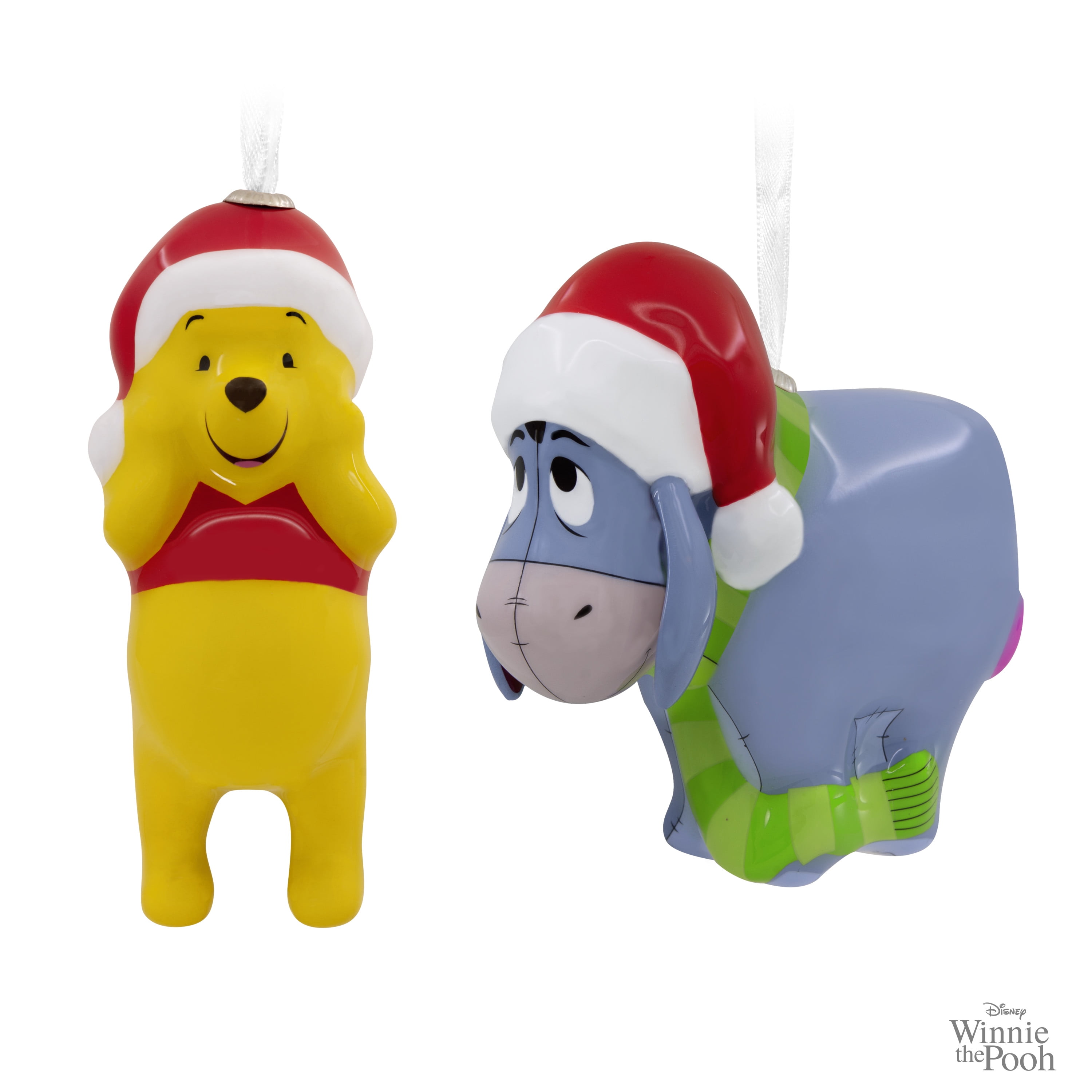 Sweeten the holidays with these cute Christmas tree ornaments. Set of two stylized decoupage designs features everyone’s favorite silly ol’ bear wearing a Santa hat and Winnie the Pooh’s gloomy, but festively dressed, pal Eeyore. Hallmark Ornaments celebrate characters and personalities from contemporary and classic movies, TV shows, toys, entertainment and sports. Each festive and collectible ornament is perfect for sharing with family and friends. ©Disney Based on the "Winnie the Pooh" works by A.A. Milne and E.H. Shepard.