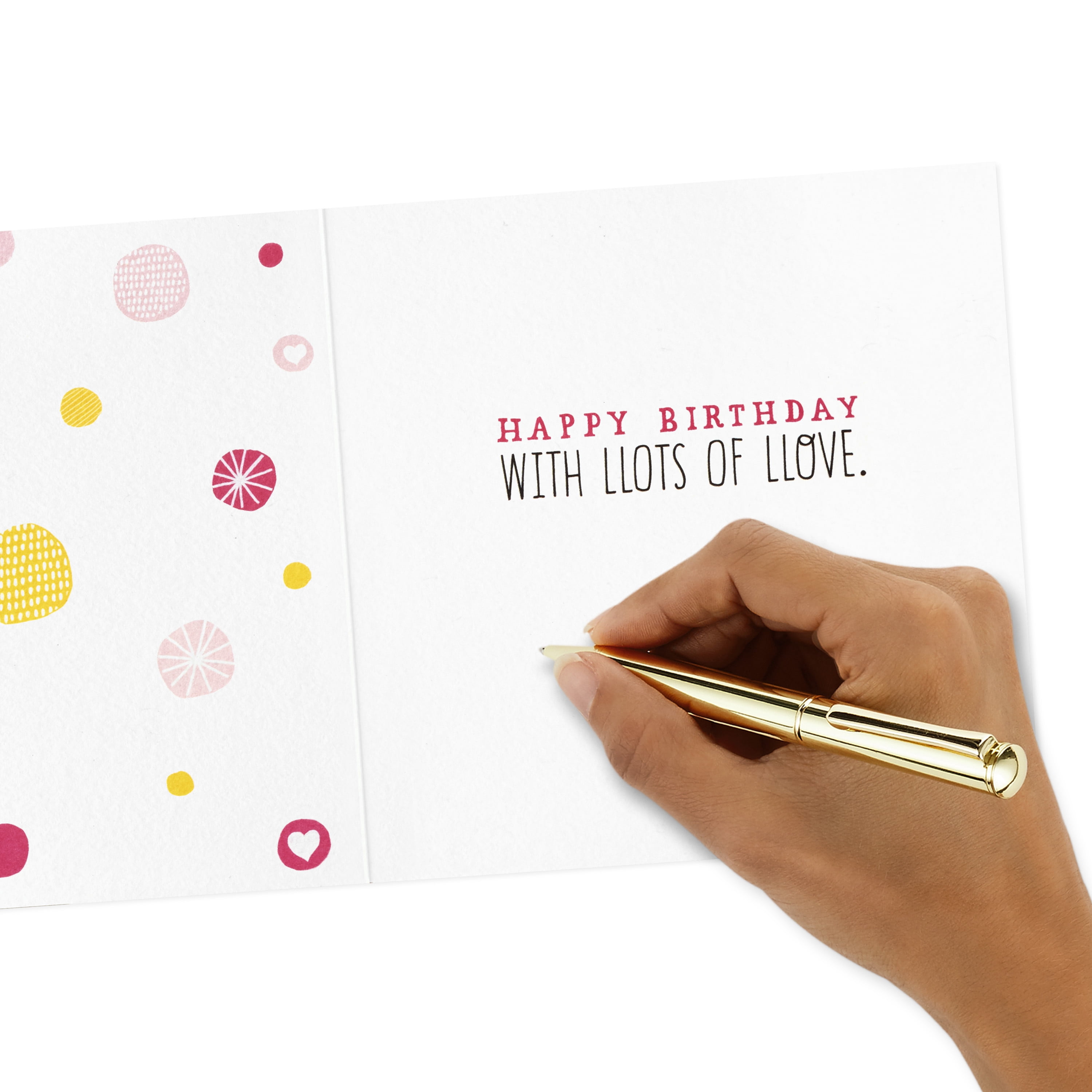 - Front features a cute photo of a llama pulling a face. Inside reads: "Happy Birthday with llots of llove."
