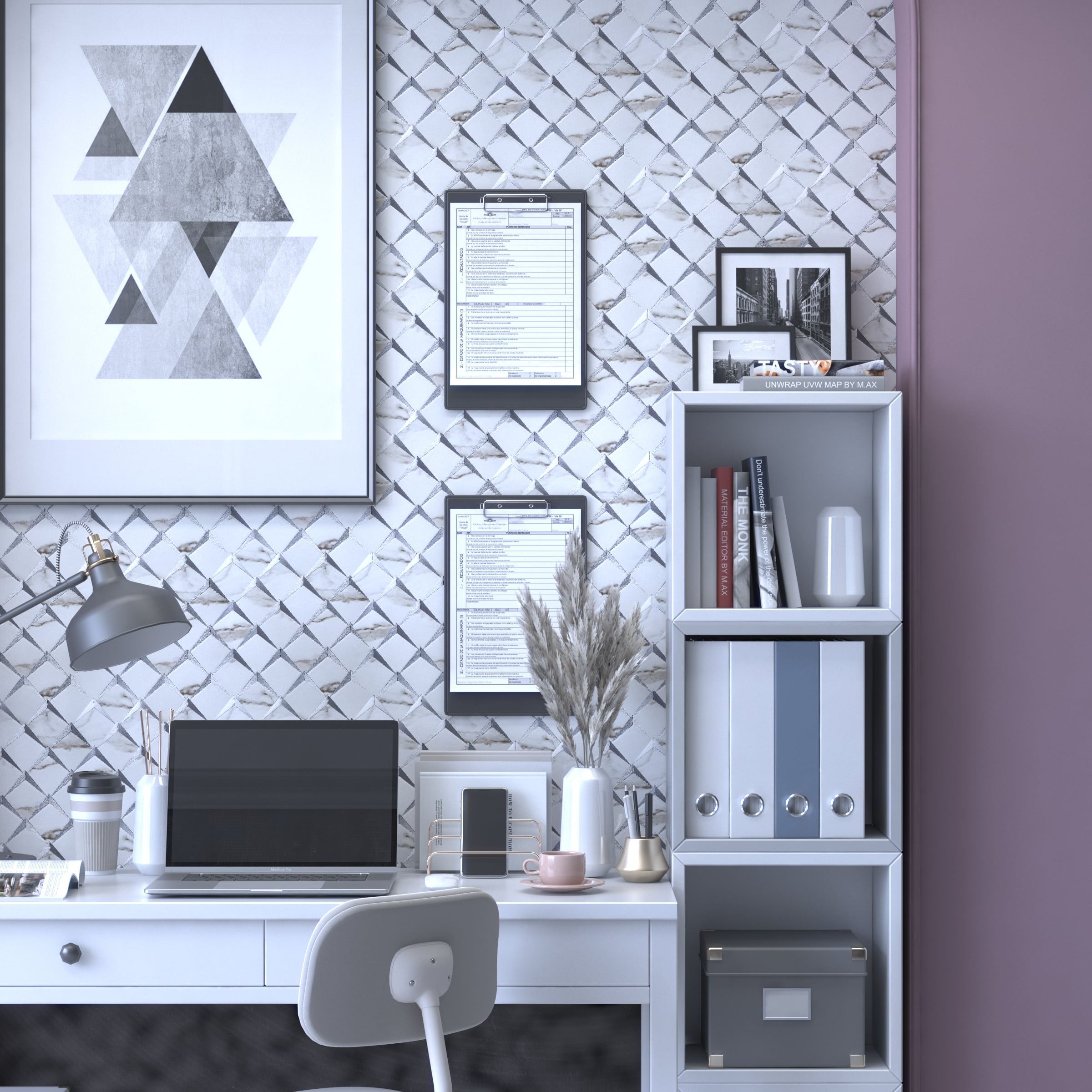 The luxe diamond pattern of this aluminum stick-on backsplash tile elevates interior walls everywhere. The decorative wall tile is at once classic and contemporary with implied marble veining accentuated with silver metallic chevrons. Peel-and-stick backing makes each self-adhesive mosaic sheet a cinch to apply, while interlocking edges ensure a tight fit across every vertical surface.