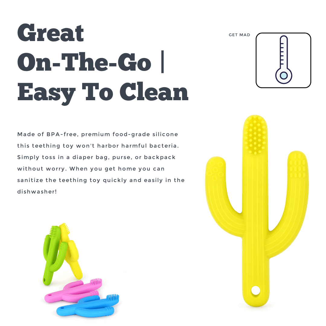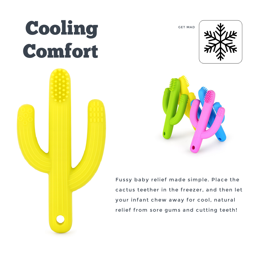 Fussy baby relief made simple. Place the cactus teether in the freezer, and then let your infant chew away for cool, natural relief from sore gums and cutting teeth!