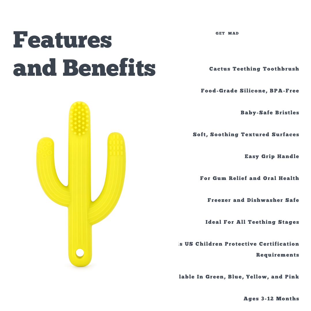Just4Tots by MAD – Cactus Teething Toothbrush – 2-in-1 Baby Teether Toy – Gum Soother and Massager for Natural Teething Relief – Made of Soft, BPA-Free Food Grade Silicone – Yellow
