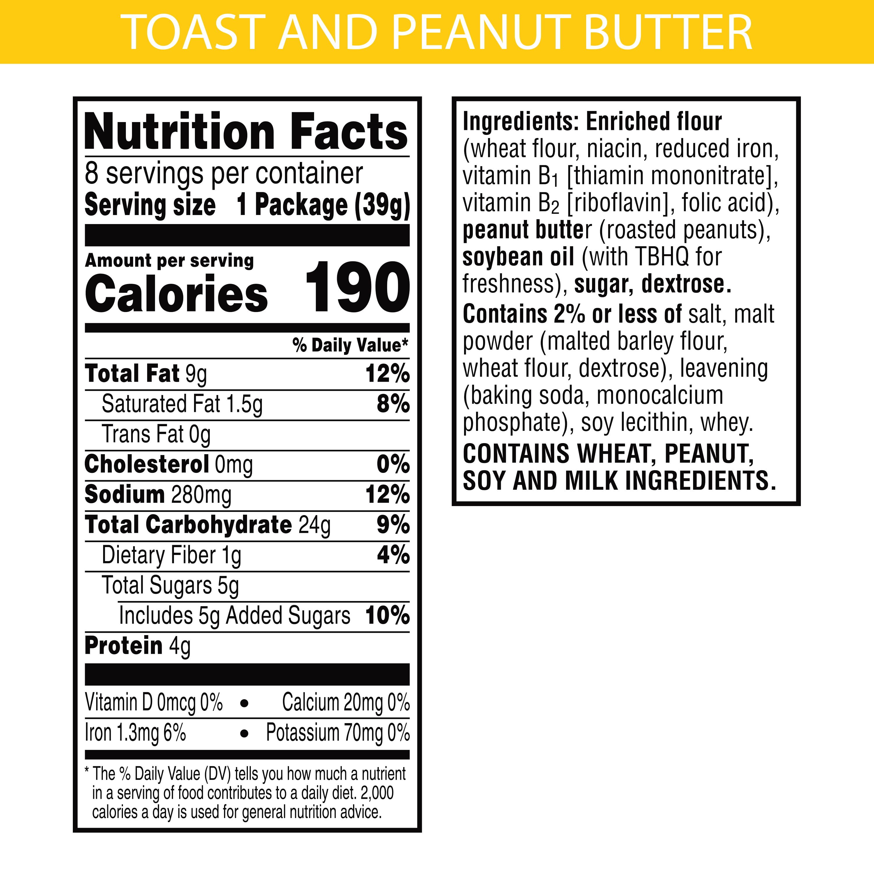 Keebler Toast and Peanut Butter sandwich crackers are the real deal – these conveniently-packaged crackers feature a tempting combination of crunchy crackers sandwiched around a tasty filling made with real peanut butter for total snacking satisfaction. These crunchy, flaky sandwich crackers pack a huge punch of flavor that’s irresistible for anytime snack cravings. Keebler Toast and Peanut Butter sandwich crackers are a great snack to pass out at game time, add to a party spread, pack in a school lunch, enjoy as an after-school treat, grab for late-night snacking and more – the peanut-buttery options are endless. When it’s time for an out-of-home excursion, toss a package of Keebler sandwich crackers in your tote to bring along on field trips, trips to the park, or even while you’re running your everyday errands. You’ll love the one-of-a-kind flavor of real peanut butter in every tasty package of Keebler Toast and Peanut Butter sandwich crackers.