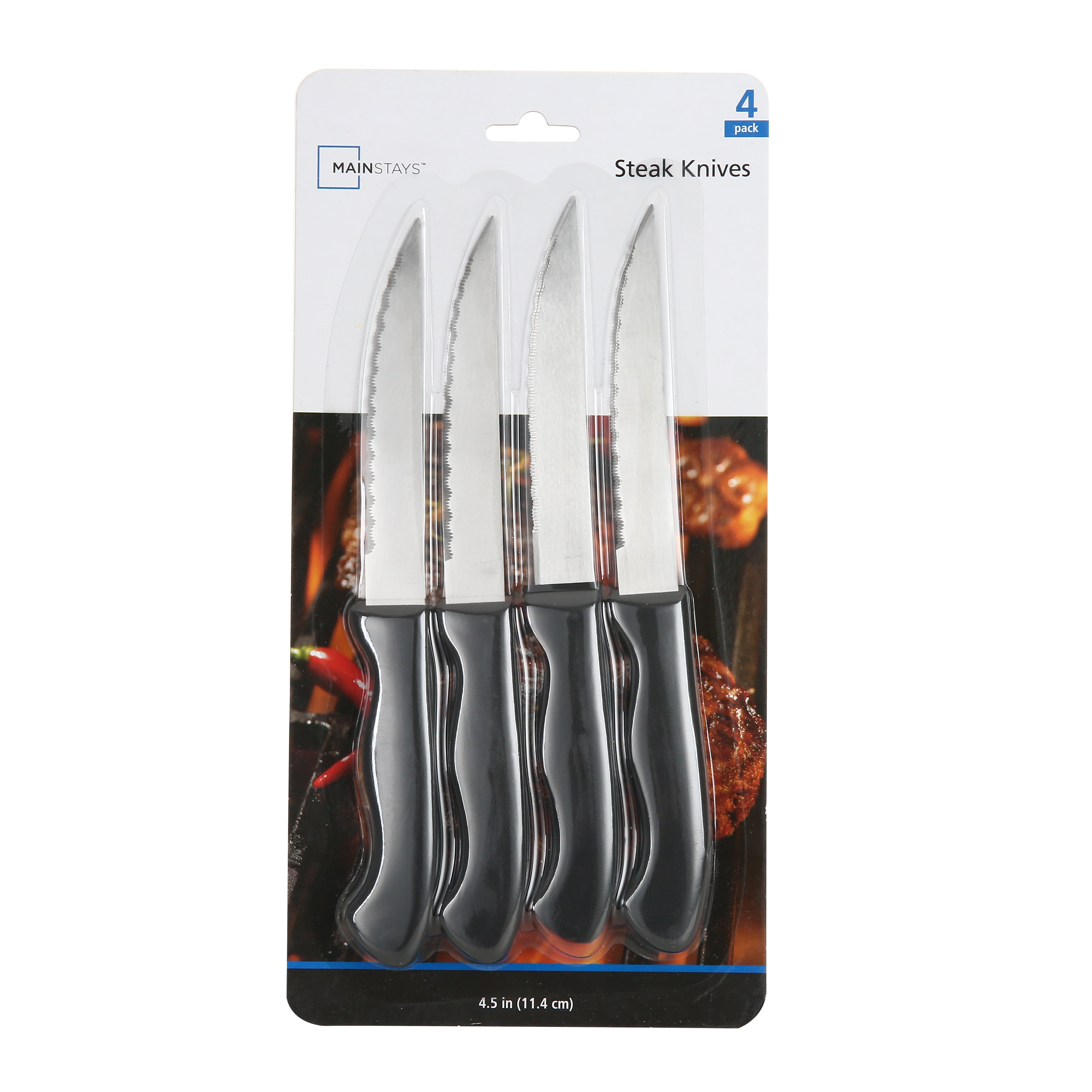 These steak knives feature a sharp never need sharpening serrated blade that cuts through many textured foods and is ideal for cutting tough meats such as steak, roast, pork chops or other meats that can be difficult for standard knives to handle. It comes in a set of four pieces. The neutral soft grip black handle of this item will fit in easily with your existing silverware. Also suitable for use on fruits, vegetables, fish, breads and more! Easy to use. Easy to main, dishwasher safe. Combine with other kitchen knives and gadgets from the Mainstays collection (sold separately) to make preparing meals easier. Build your kitchen from the ground up with all the tools other items you need to create a useful cooking experience. The Mainstays kitchen products focuses on practical designs applied to simple everyday basics and more, keeping your daily life vibrant and efficient.